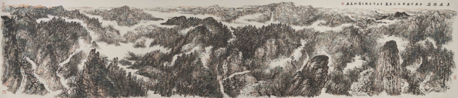 趙振川先生在這幅作品中,以雄偉的氣勢表現了秦嶺的壯美景象。作品從長安一段的秦嶺灃峪入山口展開描述,途徑觀音山、石羊關最終到達秦嶺梁頂的中國南北分水線處,在梁頂遠眺秦嶺雄風。放眼向西望去,遠處的山峰是秦嶺黃花嶺,巍峨聳立、蒼茫多姿、神韻縹緲;向東望去是著名的牛背梁,青松挺拔、綠樹成蔭、生態優美。