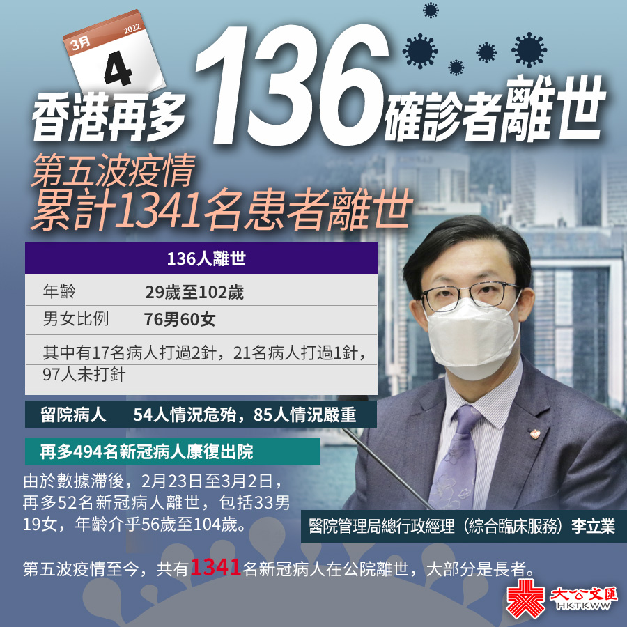 大公文匯全媒體報道,本港第五波疫情嚴峻,今日(4日)新增52523宗確診個案。醫院管理局總行政經理(綜合臨床服務)李立業今日在疫情記者會上公布,過去一日,再多136名確診者離世,年齡介乎29歲至102歲,分別為76男60女,其中有17名病人打過2針,21名病人打過1針,97人未打針。