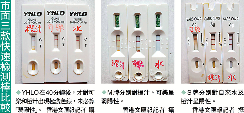香港文匯報記者昨日在沙田大型連鎖藥房購買三款快測套裝,每套售價介乎40元至78元不等,當中一款是特區政府認可使用的YHLO,其餘兩款則為M牌及S牌產品。記者以自來水、可樂及橙汁飲品,分別滴入九支測試棒,並按說明書指示的時間等候觀察結果。