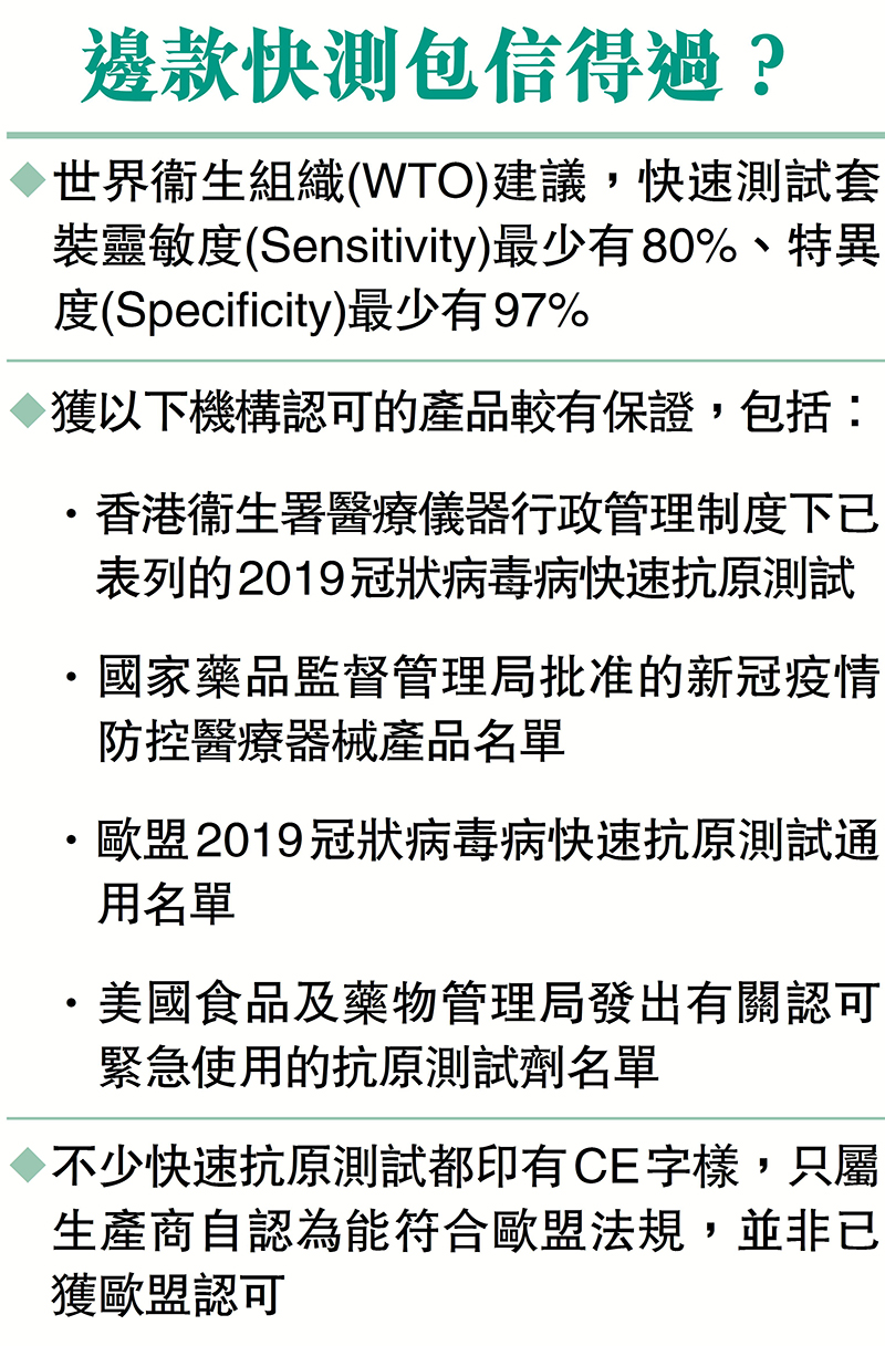 由於檢測包有價有市,在「搶爛市」下,質素良莠不齊,市民選購時需留意生產日期、限期日及藥廠資料。除了關注質素,不少市民近日留意到以快速檢測結果申領病假是否存在漏洞。