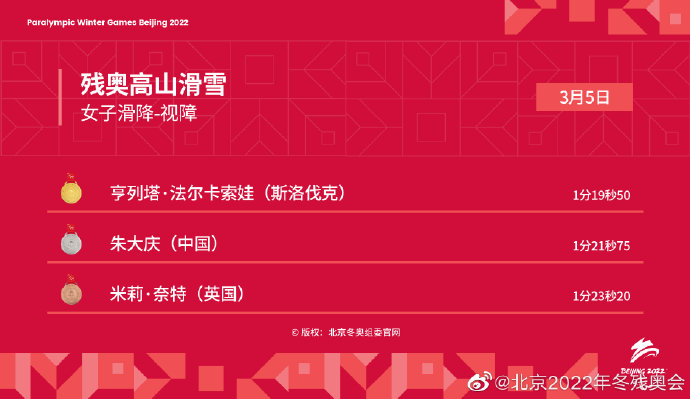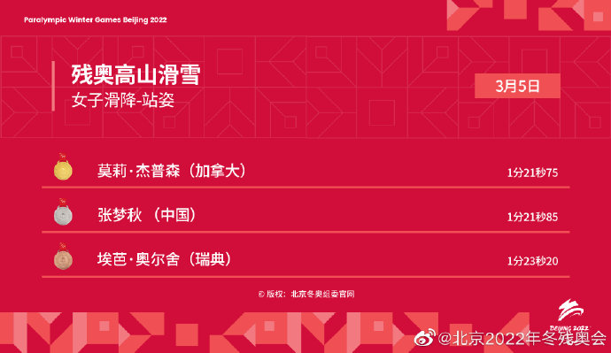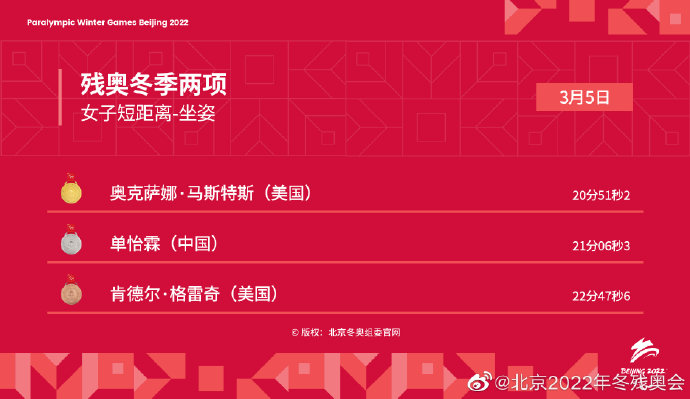 據人民日報報道,今日(5日)是北京冬殘奧會比賽第一日,截至發稿時,在北京冬殘奧會女子滑降站姿項目中,張夢秋奪得銀牌;在北京冬殘奧會冬季兩項女子6公里(坐姿組)比賽中,單怡霖奪得銀牌;此前,在北京冬殘奧會高山滑雪女子滑降(視力障礙組)比賽中,朱大慶奪得銀牌。