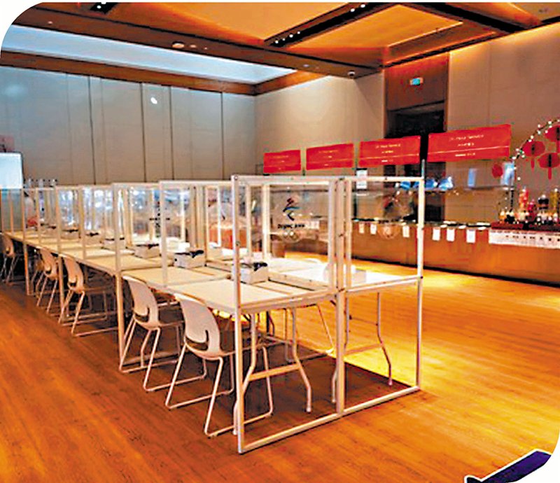 在運動員餐廳,不僅餐桌高度、容膝空間及桌椅物品布局擺放充分考慮了輪椅使用者的需求,還專門預留輪椅餐位46個,升高桌椅的高度,便於坐輪椅就餐。同時,餐廳還降低了食品飲料桌、手消機、餐具台、垃圾台等高度,以方便輪椅使用者自助服務。