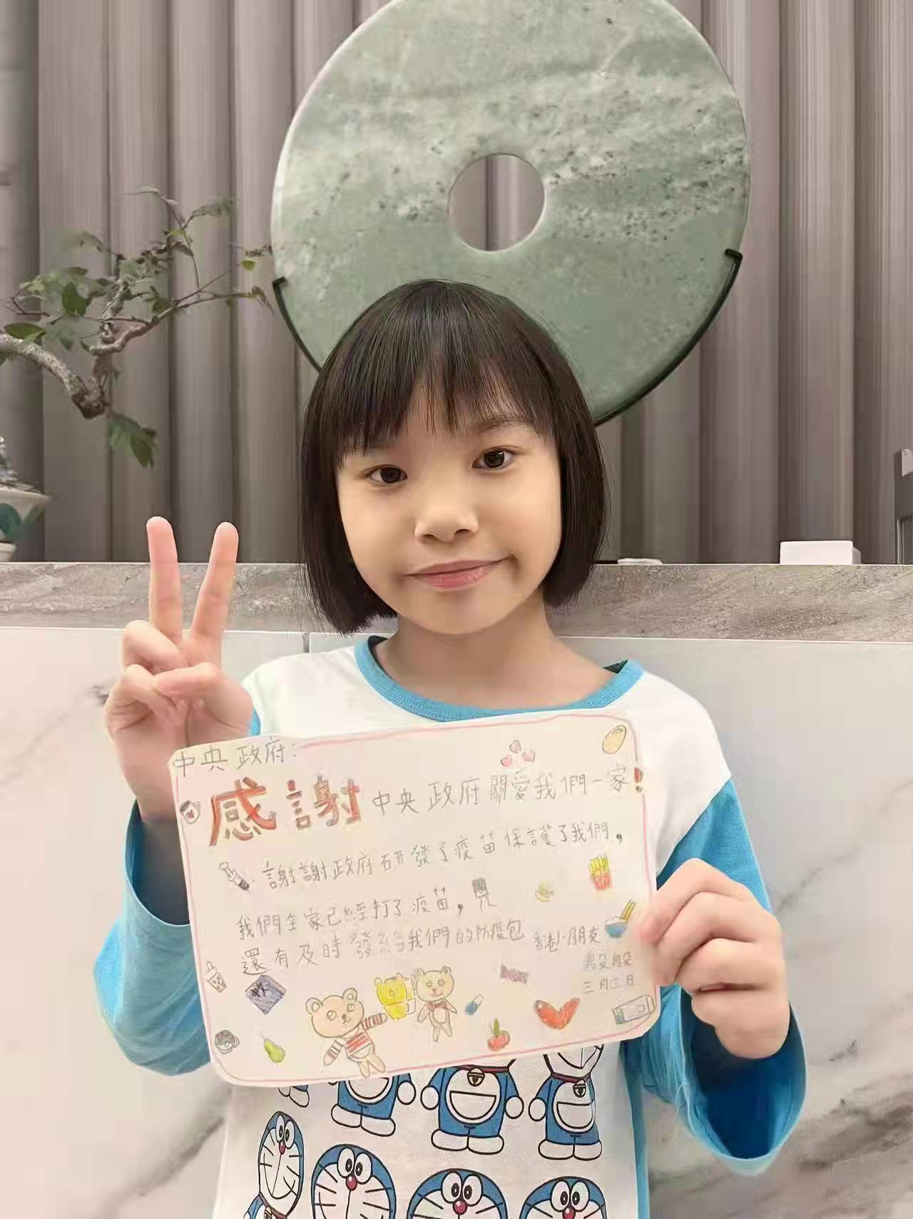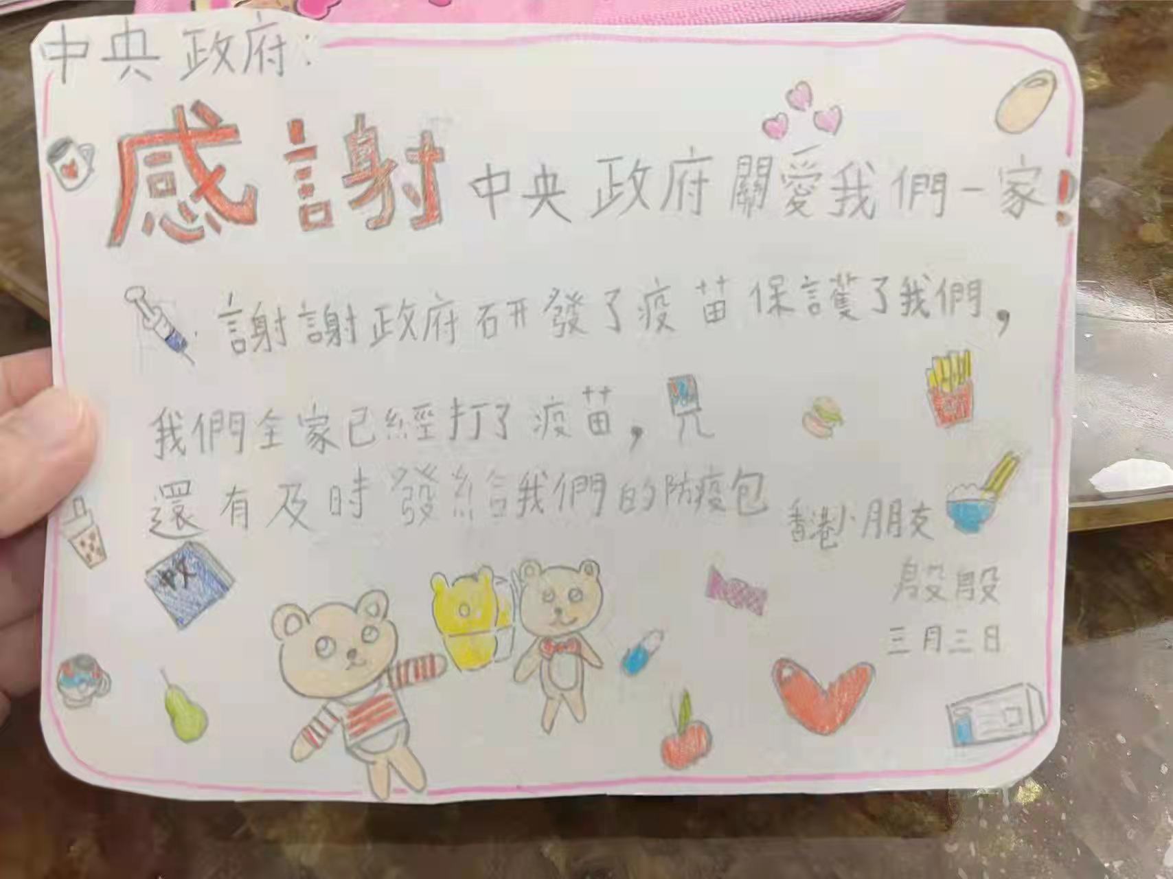 在中央政府的全力支持下,本港疫情沒有進一步惡化,全港市民都感受來自中央的關懷,極大地提振了抗擊疫情、戰勝疫情的決心和信心。大公文匯全媒體今日(7日)收到一位叫殷殷的香港小朋友感謝信,她表示感謝來自中央政府的關愛,謝謝中央政府源源不斷地供給香港新冠疫苗,令到她可以接種到疫苗,降低不幸染疫後出現嚴重併發症,甚至死亡的機率。同時,感謝中央在香港疫情嚴峻的危急時刻,為香港提供大量的防疫物資,為市民派發抗疫包,讓市民有信心,有底氣去抗擊疫情。她亦期望家長可以留意及為家中老幼報名接種疫苗。