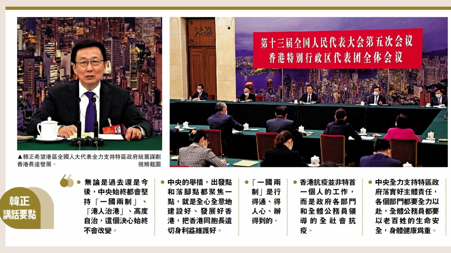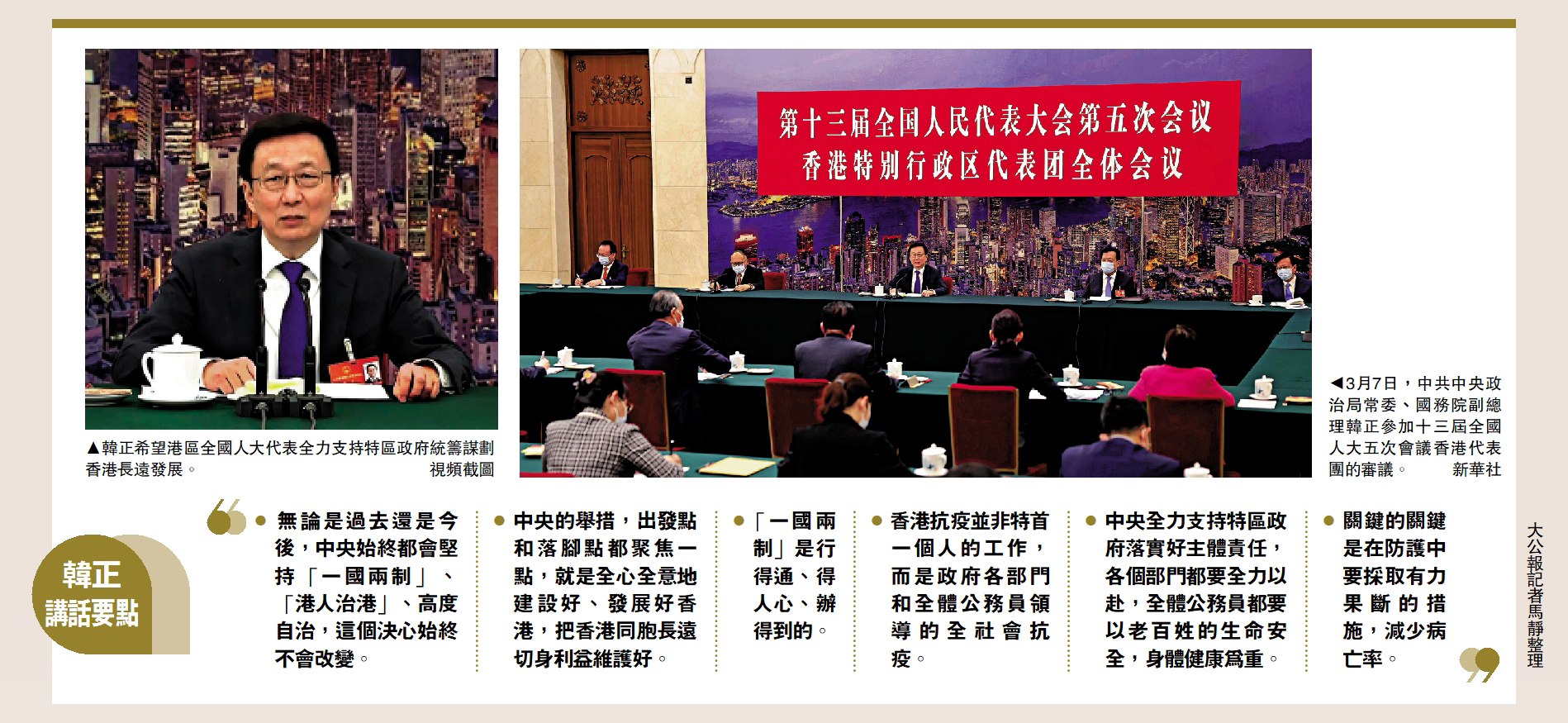 【大公報記者 馬靜北京報道】中共中央政治局常委、國務院副總理韓正7日上午參加十三屆全國人大五次會議香港代表團審議並發表重要講話。香港全國人大代表團新聞發言人陳勇在會後對媒體表示,韓正副總理在講話中重申,無論是過去還是今後,中央始終都會堅持「一國兩制」、「港人治港」、高度自治,這個決心始終不會改變。中央制定出台的舉措,都是為了香港長期繁榮穩定和長治久安,維護香港同胞長遠切身利益。