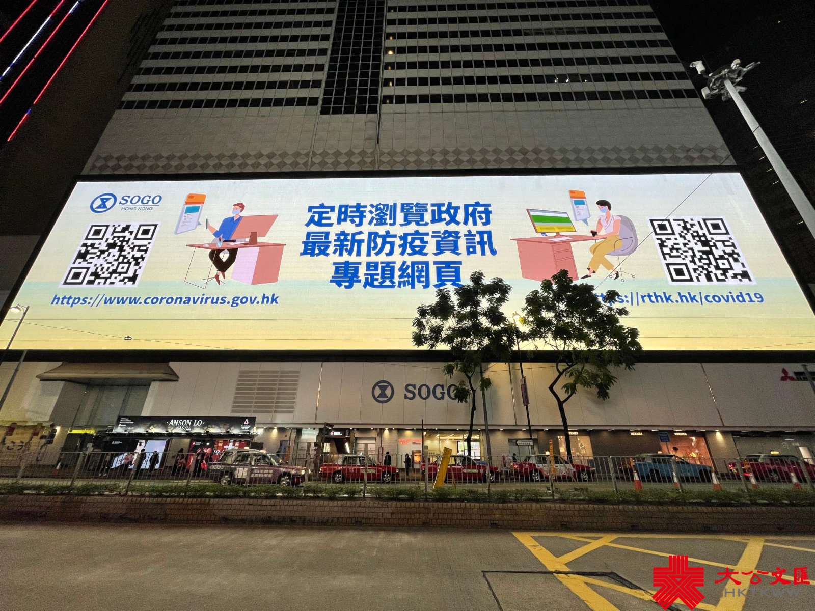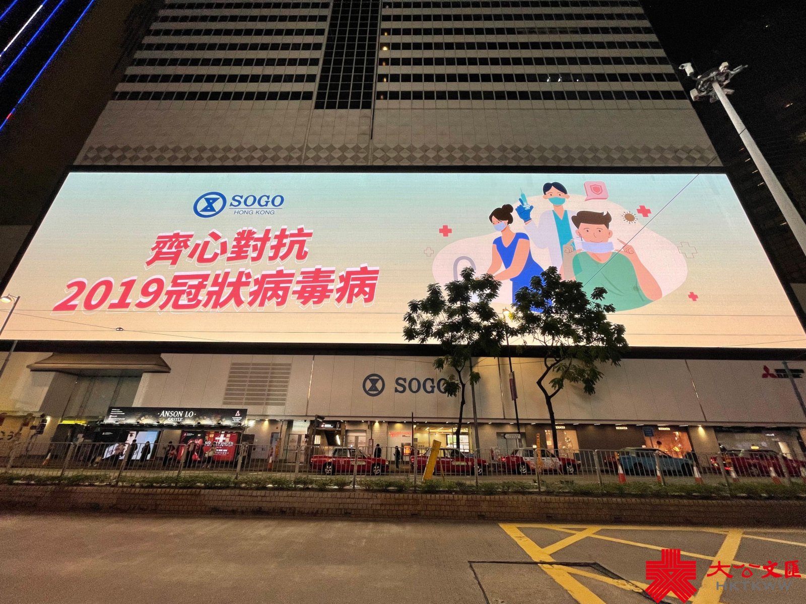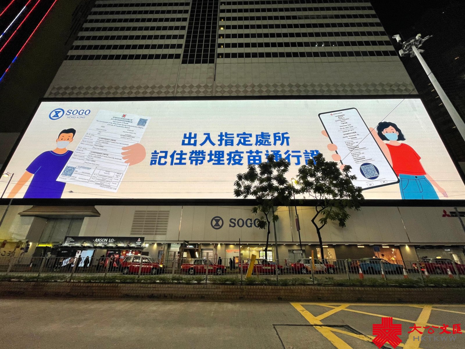本港第五波疫情嚴峻。近日,銅鑼灣崇光百貨(SOGO)大屏幕循環播放抗疫公益廣告,為全港市民齊心抗疫打氣,呼籲市民注意個人及環境衞生、保持社交距離、定時瀏覽政府最新防疫資訊及為兒童接種新冠疫苗,並緊記出入各場所掃安心出行二維碼,而前往指定處所須帶上疫苗通行證等。