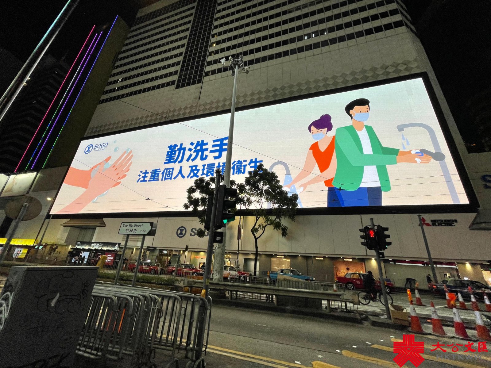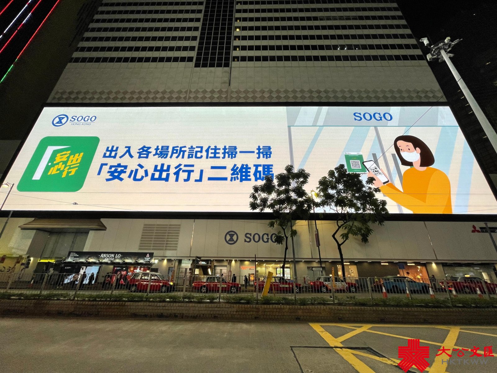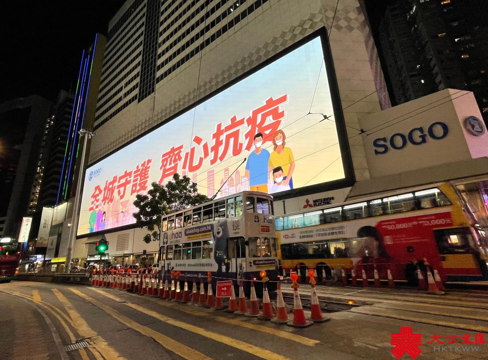 本港第五波疫情嚴峻。近日,銅鑼灣崇光百貨(SOGO)大屏幕循環播放抗疫公益廣告,為全港市民齊心抗疫打氣,呼籲市民注意個人及環境衞生、保持社交距離、定時瀏覽政府最新防疫資訊及為兒童接種新冠疫苗,並緊記出入各場所掃安心出行二維碼,而前往指定處所須帶上疫苗通行證等。
