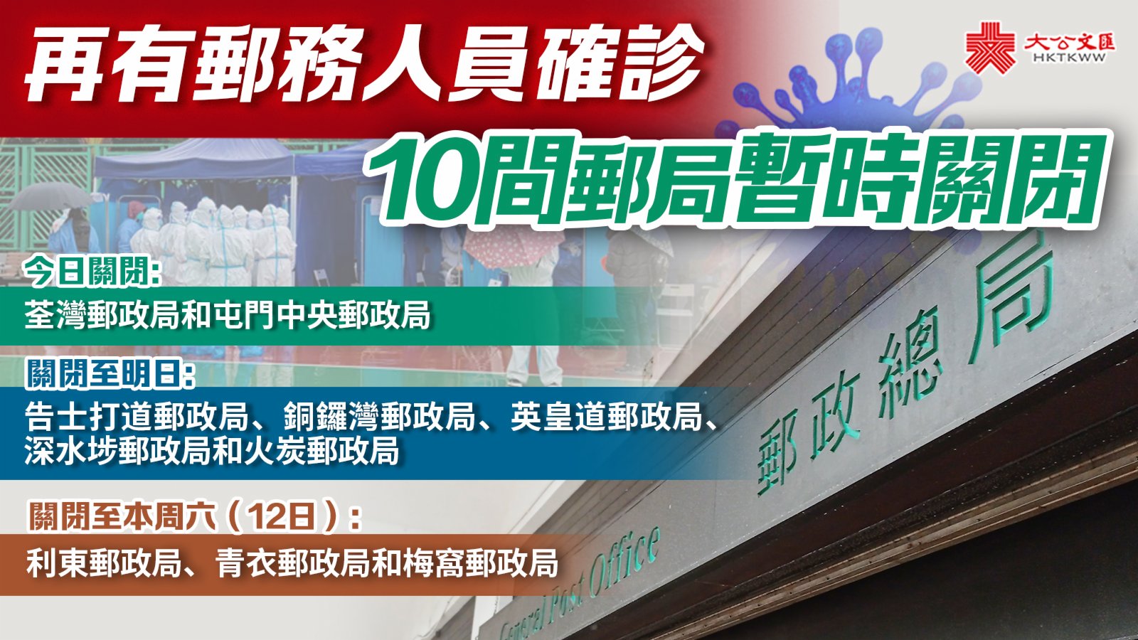 大公文匯全媒體報道,再有多間郵政局因為郵務人員染疫需要關閉。香港郵政今日(10日)宣布,荃灣郵政局和屯門中央郵政局今日關閉。告士打道郵政局、銅鑼灣郵政局、英皇道郵政局、深水埗郵政局和火炭郵政局關閉至明日。另外,利東郵政局、青衣郵政局和梅窩郵政局則需關閉至本周六(12日)。