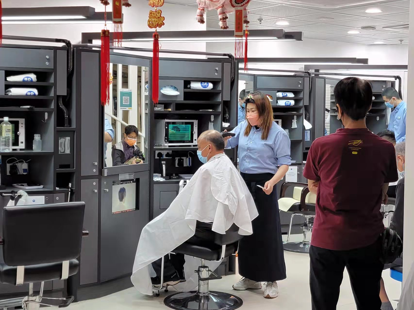 隨後大公文匯全媒體記者到商場內的專門理髮店,店內除了提供剪髮,亦有洗頭、電髮及焗油美髮服務,記者發現店內等候的人數比較少,有顧客張小姐表示知道今天不少理髮店都大排長龍,她選擇專門的理髮店,因為這類店舖收費比較高,人流較少而且可預約,不用等候太多時間。