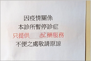 不過,深水埗區有多間診所表明「暫停診症,只提供配藥服務」。記者進入大埔道一間寫明「暫停診症」的診所查詢,即使並非發燒或確診新冠肺炎,助護仍稱因疫情嚴峻,診所已停止所有診症服務,家屬或病人可描述病徵,由助護轉告醫生後配藥,每次三日藥收費300元。