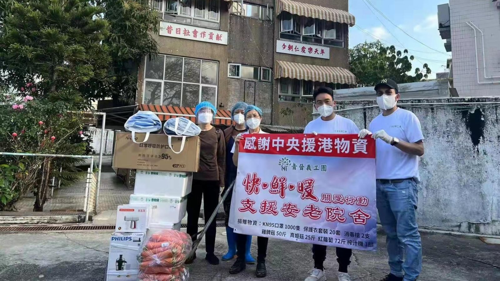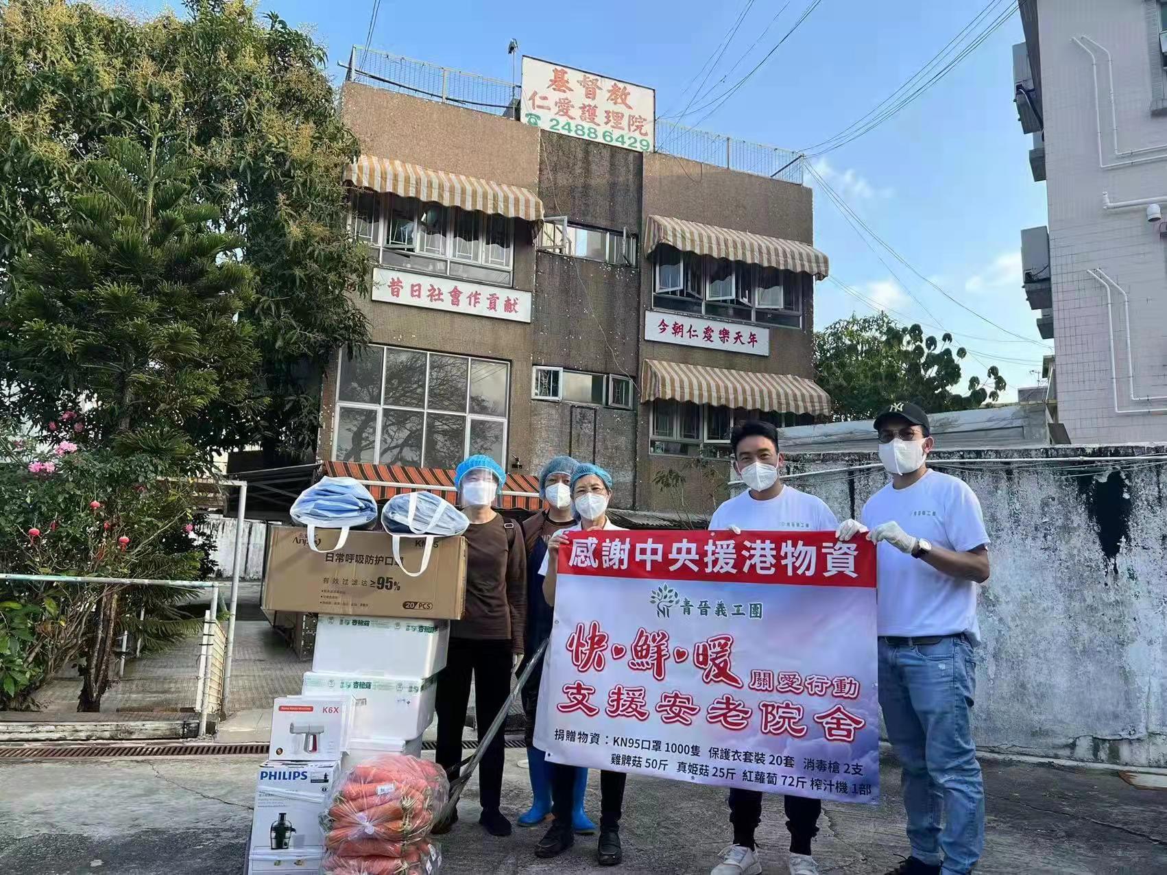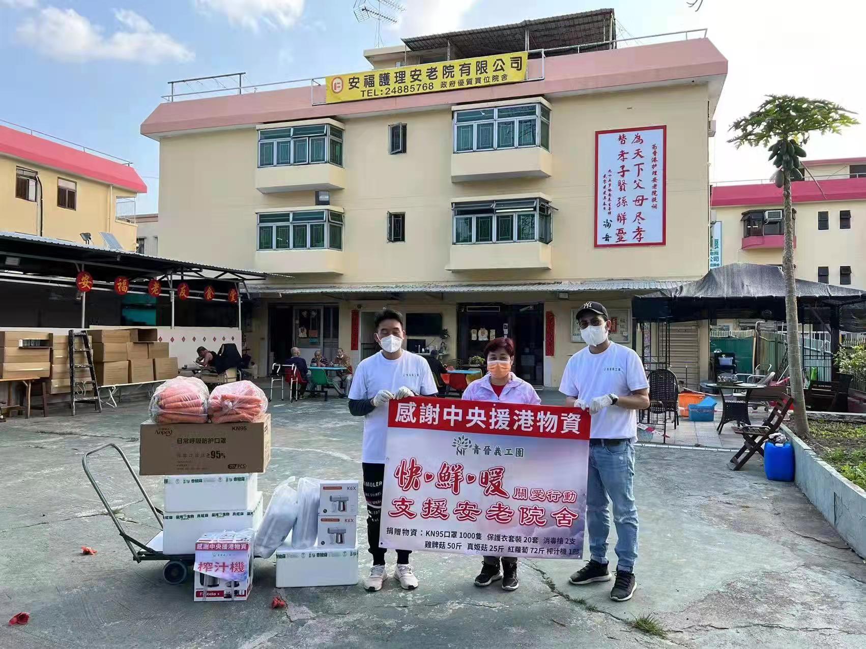 青晉義工團團長陳嘉輝介紹,他們早前了解到不少院舍需要保護衣、消毒槍、高質量的口罩和一些新鮮蔬果等。為此,他們積極籌畫這次行動,創會會長郭晉昇說,「快」是指回應速度快,急安老院舍所急,他們第一時間籌集相關物資;「鮮」是指食材新鮮,這次愛心物資中包括新鮮到港的雞髀菇、真姬菇和紅蘿蔔等;「暖」是指讓安老院舍的長者和員工實實在在感受到中央的關懷和社會各界的關心。