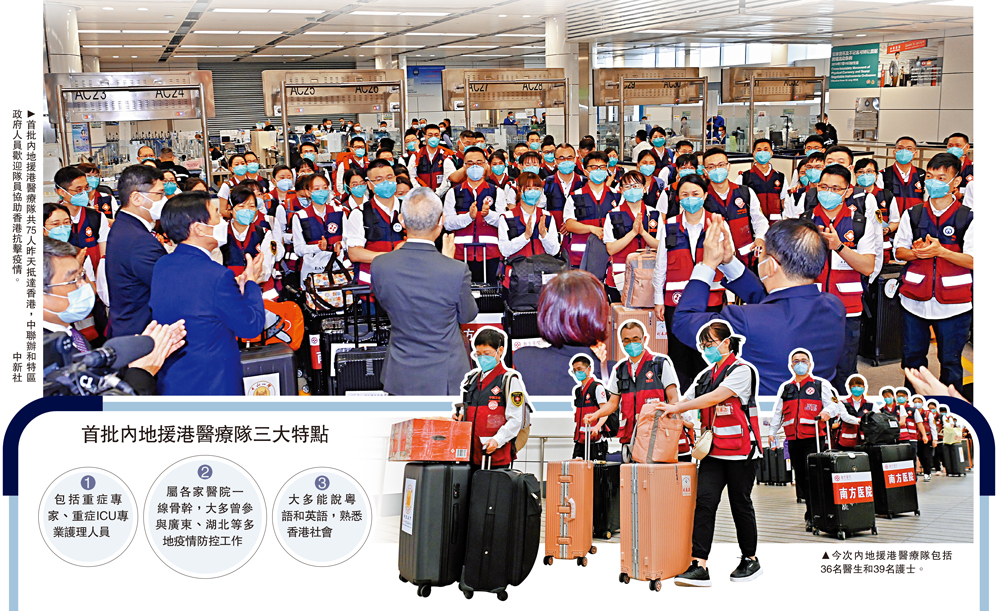 首批75名內地醫護昨日來港,多位本港政界人士感謝國家對香港的大力支持、感謝內地醫護人員馳援香港。他們說,內地疫情防控也有壓力,但中央仍抽調人力物力援港,顯示出中央對香港的關心愛護,也為香港抗疫打下了強心針,特區政府應該用好援港資源、落實好主體責任,全力戰疫。