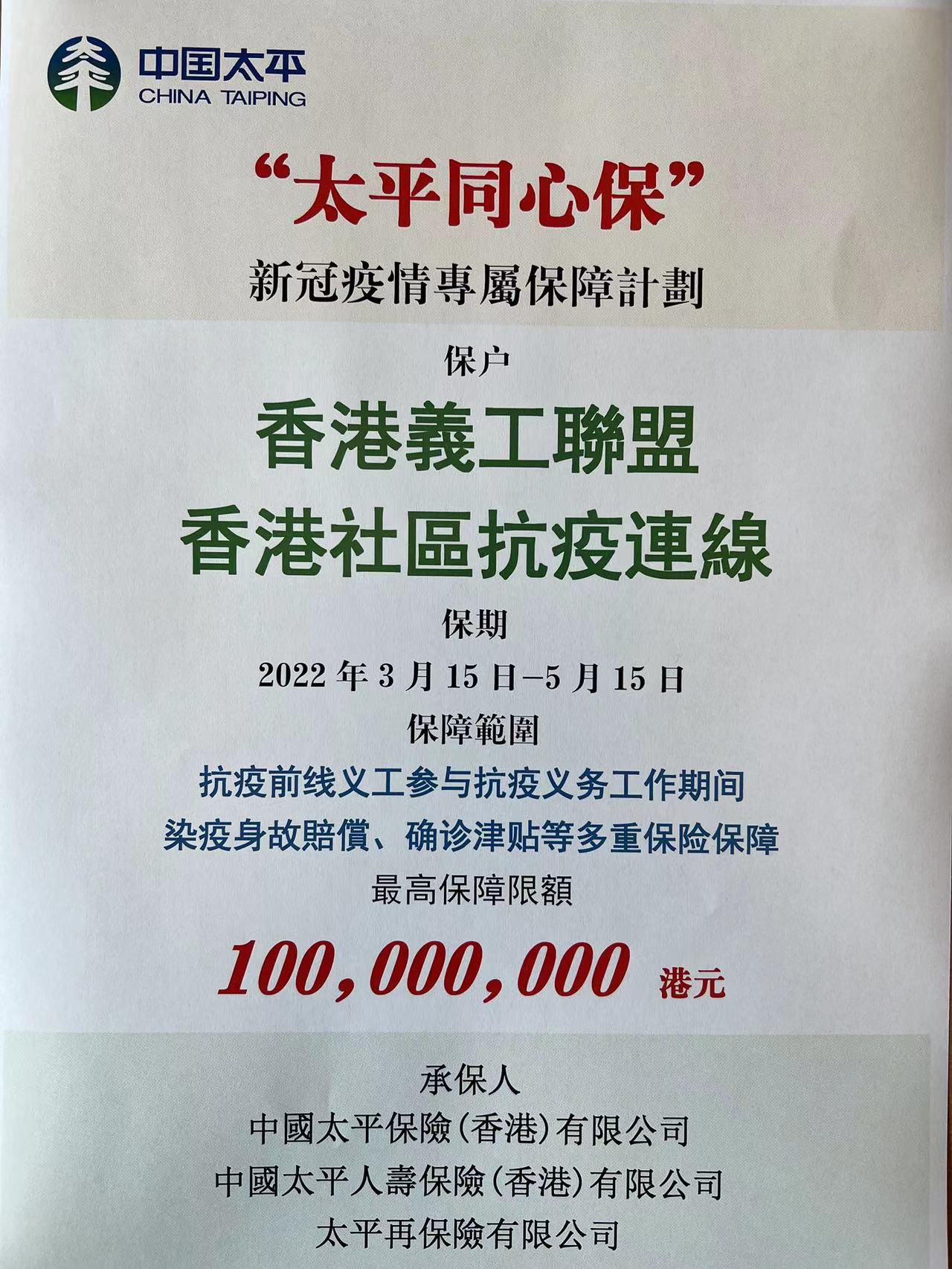 「全港抗疫義工同盟」成立後,作為總部在港的金融央企——中國太平,在集團董事長王思東的帶領下,堅決履行駐港央企責任擔當,在第一時間主動對接其保險保障需求,旗下三家專業保險公司,中國太平保險(香港)有限公司、中國太平人壽保險(香港)有限公司、太平再保險有限公司攜手打造設計「太平同心保」保險保障計劃,為「全港抗疫義工同盟」1萬名抗疫前線義工,免費提供抗疫義務工作期間染疫身故賠償、確診津貼等多重保險保障,累計責任限額1億港元,以解義工的後顧之憂。