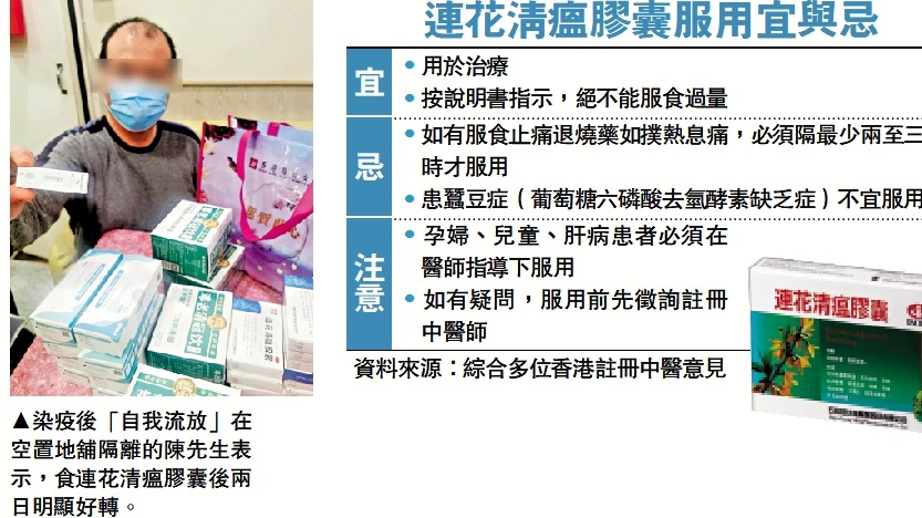 註冊中醫師林蓓茵指出,任何藥物服用過量也有反效果,而且連花清瘟膠囊並非用於預防,「原理就像你沒有發燒,就不要吃止痛退燒藥,如果服食太多,退燒藥也可以食死人一樣!」她建議,兒童、孕婦、哺乳期婦女,詢問醫生或中醫師意見才服用,現時不少中醫師提供網上診症服務,幫助患者留在家中得到適當的治療。