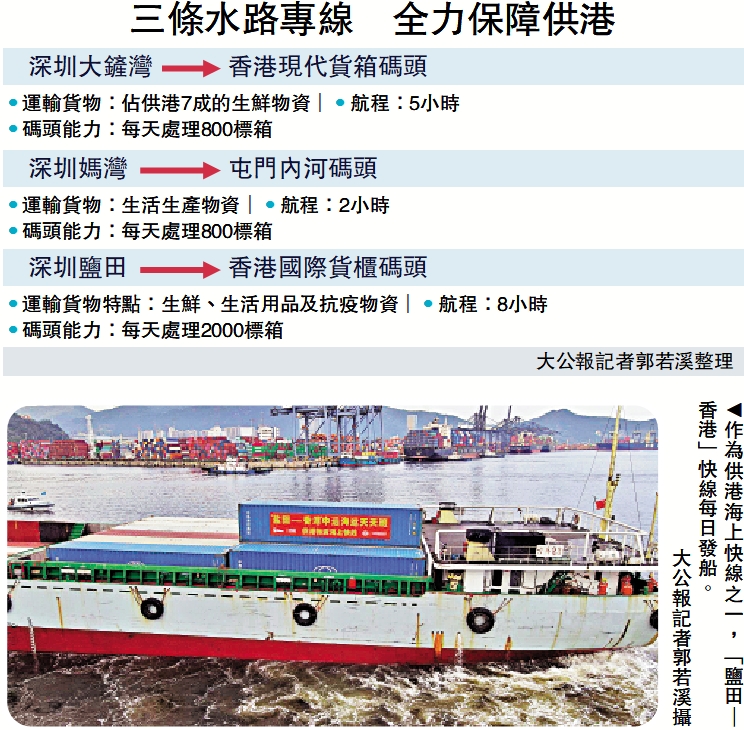 自2月22日起,深圳港大鏟灣、媽灣和鹽田集裝箱港區設立水路集散分流點,正式全面開通「大鏟灣碼頭─香港現代貨箱碼頭」「媽灣碼頭─屯門內河碼頭」「鹽田國際碼頭─香港國際貨櫃碼頭」定時定點駁船航線,全力保障香港同胞物資供應。