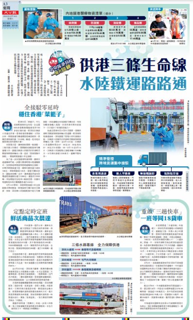 【大公報記者石華、郭若溪、盧靜怡報道】自2月16日內地支援香港抗疫工作專班成立,如今已滿一個月。急民所急,香港防疫抗疫、生活生產物資需求量大,因此必須採用多種運輸方式提高供港物資供應能力,全力保障對港物資供應,助力香港抗疫。一個月間,廣東省通過優化粵港跨境運輸模式,陸路、水路、鐵路三路並舉,加開供港專線,創新接駁方式,保證充足運力,在香港疫情防控的關鍵時期,打通了供港物資運輸的生命線,全力保障香港市民日常生活物資供應。