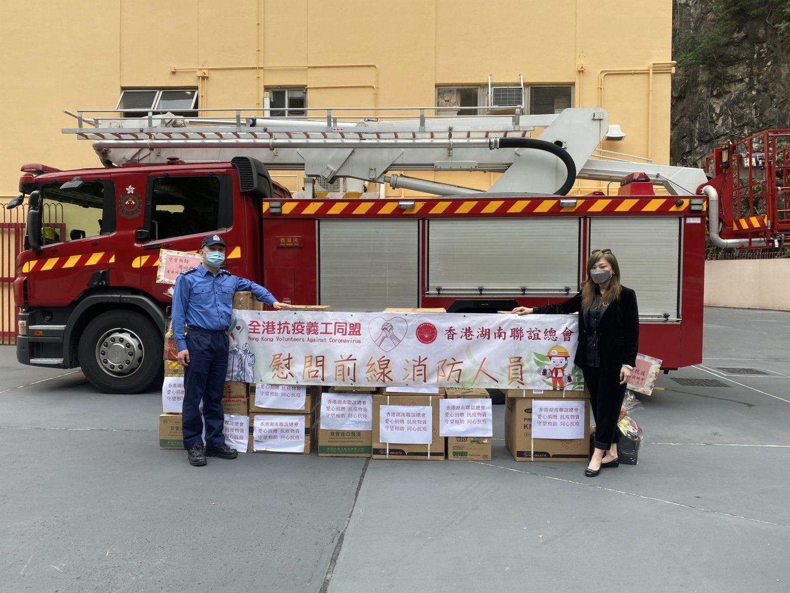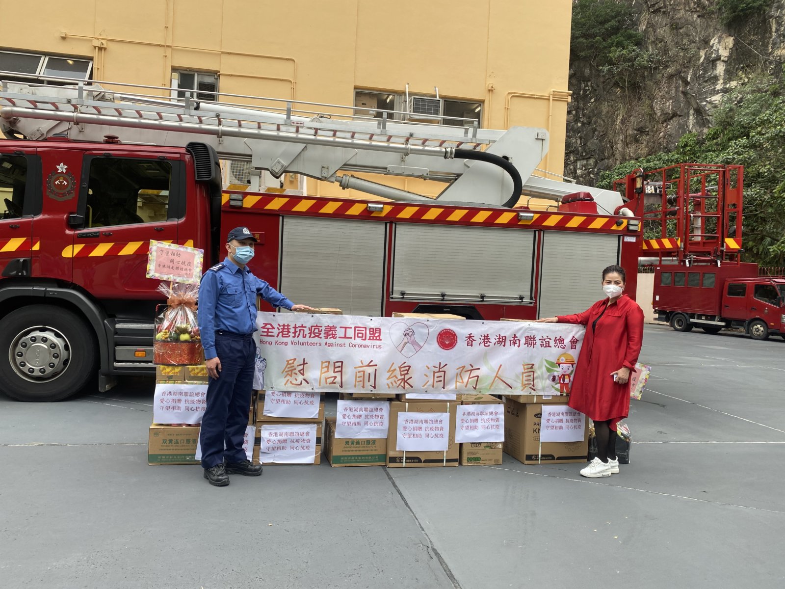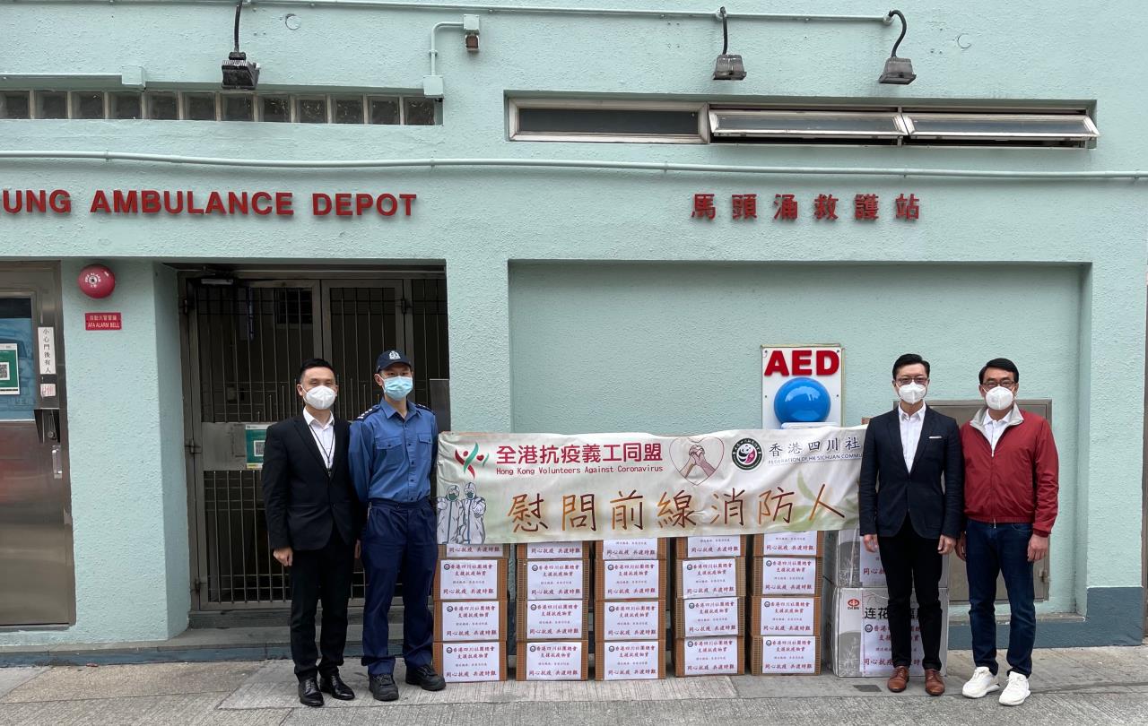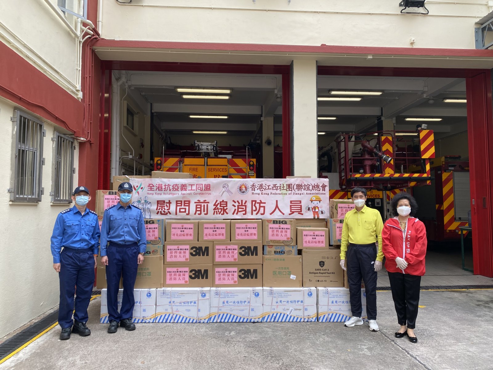 為感謝長期在抗疫「戰場」奮勇作戰的前線消防救護人員,3月16日全港抗疫義工同盟發動廣東社團總會、福建社團聯會、廣西社團總會、海南社團總會、浙江省同鄉會聯合會、湖南聯誼總會、山東社團總會、湖北社團總會、江西社團(聯誼)總會、四川社團總會等同鄉社團的義工,赴港島、九龍、新界慰問前線消防人員。同鄉社團先後探訪了上環消防局、西灣河消防局、西灣河救護站、馬頭涌消防局、馬頭涌救護站、葵涌消防局、葵涌救護站等多間消防局、救護站,慰問前線消防救護人員,送上12200個N95口罩、19000個醫用口罩、15400盒快速檢測盒、2500件防護衣、7500盒連花清瘟膠囊、2700盒金花清感顆粒等抗疫物資和一些慰問食品,為他們加油打氣,讓前線救護人員切實感受到來自市民的溫暖和問候。