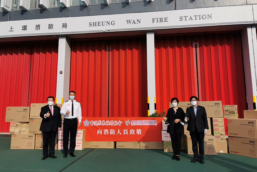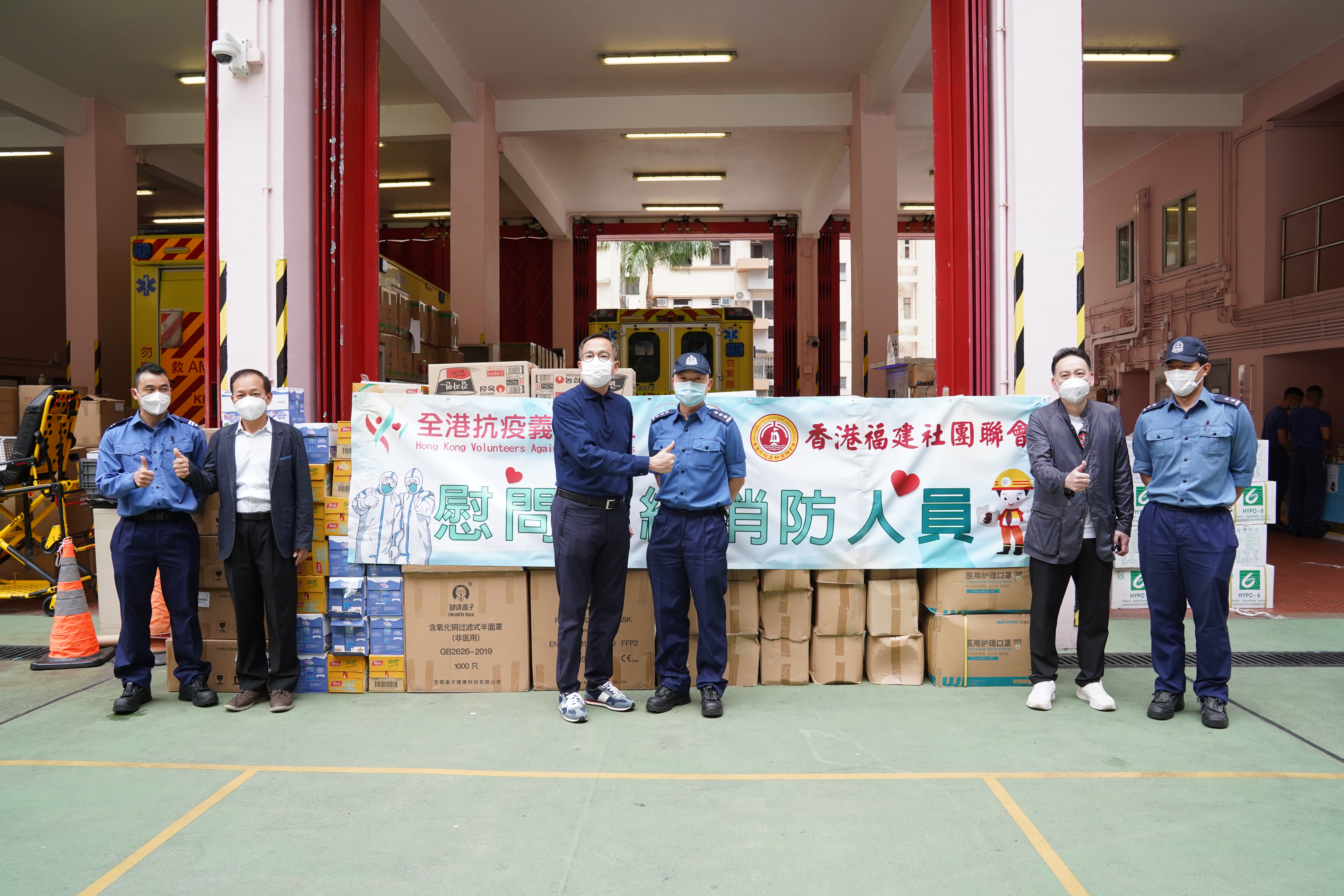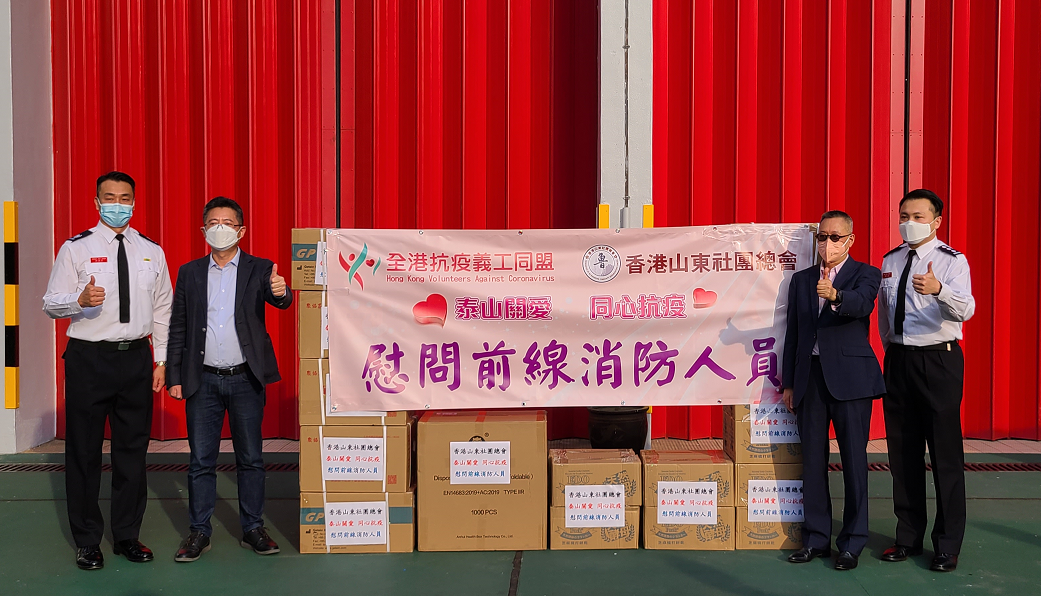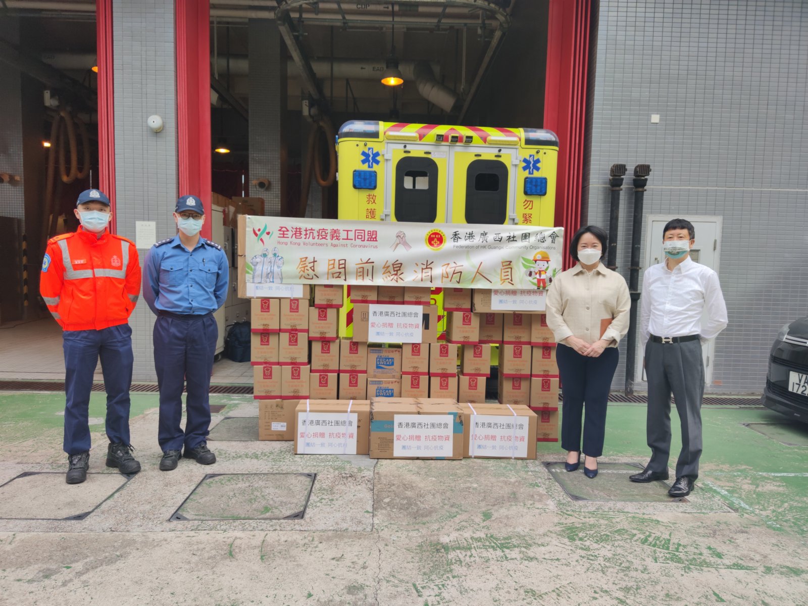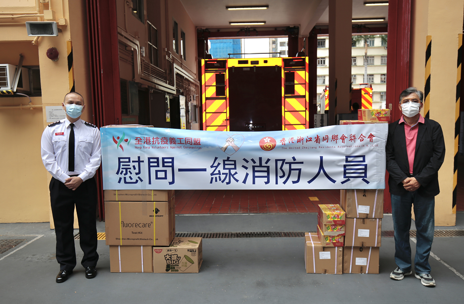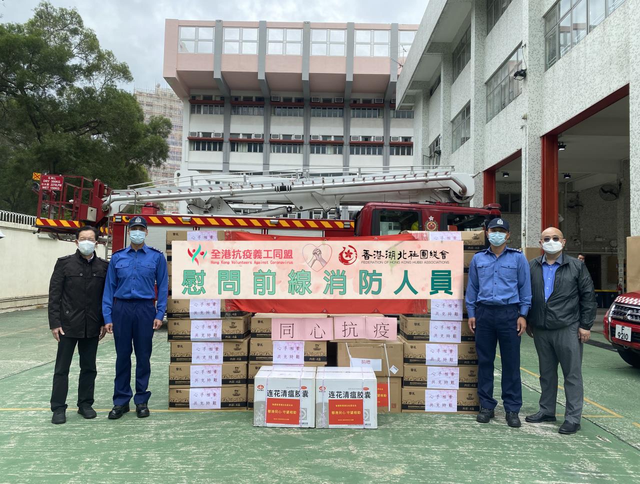 為感謝長期在抗疫「戰場」奮勇作戰的前線消防救護人員,3月16日全港抗疫義工同盟發動廣東社團總會、福建社團聯會、廣西社團總會、海南社團總會、浙江省同鄉會聯合會、湖南聯誼總會、山東社團總會、湖北社團總會、江西社團(聯誼)總會、四川社團總會等同鄉社團的義工,赴港島、九龍、新界慰問前線消防人員。同鄉社團先後探訪了上環消防局、西灣河消防局、西灣河救護站、馬頭涌消防局、馬頭涌救護站、葵涌消防局、葵涌救護站等多間消防局、救護站,慰問前線消防救護人員,送上12200個N95口罩、19000個醫用口罩、15400盒快速檢測盒、2500件防護衣、7500盒連花清瘟膠囊、2700盒金花清感顆粒等抗疫物資和一些慰問食品,為他們加油打氣,讓前線救護人員切實感受到來自市民的溫暖和問候。