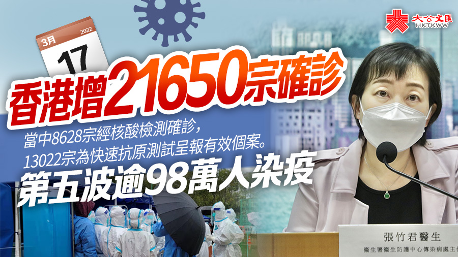 大公文匯全媒體報道,香港第五波疫情嚴峻,衞生署及醫管局今日(17日)下午舉行疫情記者會。衞生署衞生防護中心傳染病處主任張竹君公布,截至今日零時,香港新增21650宗確診個案,當中8628宗經核酸檢測確診,13022宗為快速抗原測試呈報有效個案。第五波疫情至今,香港超過98萬人染疫。