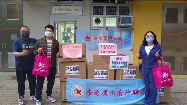 香港廣州南沙聯誼會組織了「抗疫送暖義工隊」,第一時間解決基層人士特別是居家隔離人士生活所需,協助「全港社區抗疫連線」包裝快速測試包外,亦組織義工每日上門送贈抗疫物資予確診及居家隔離的基層家庭。