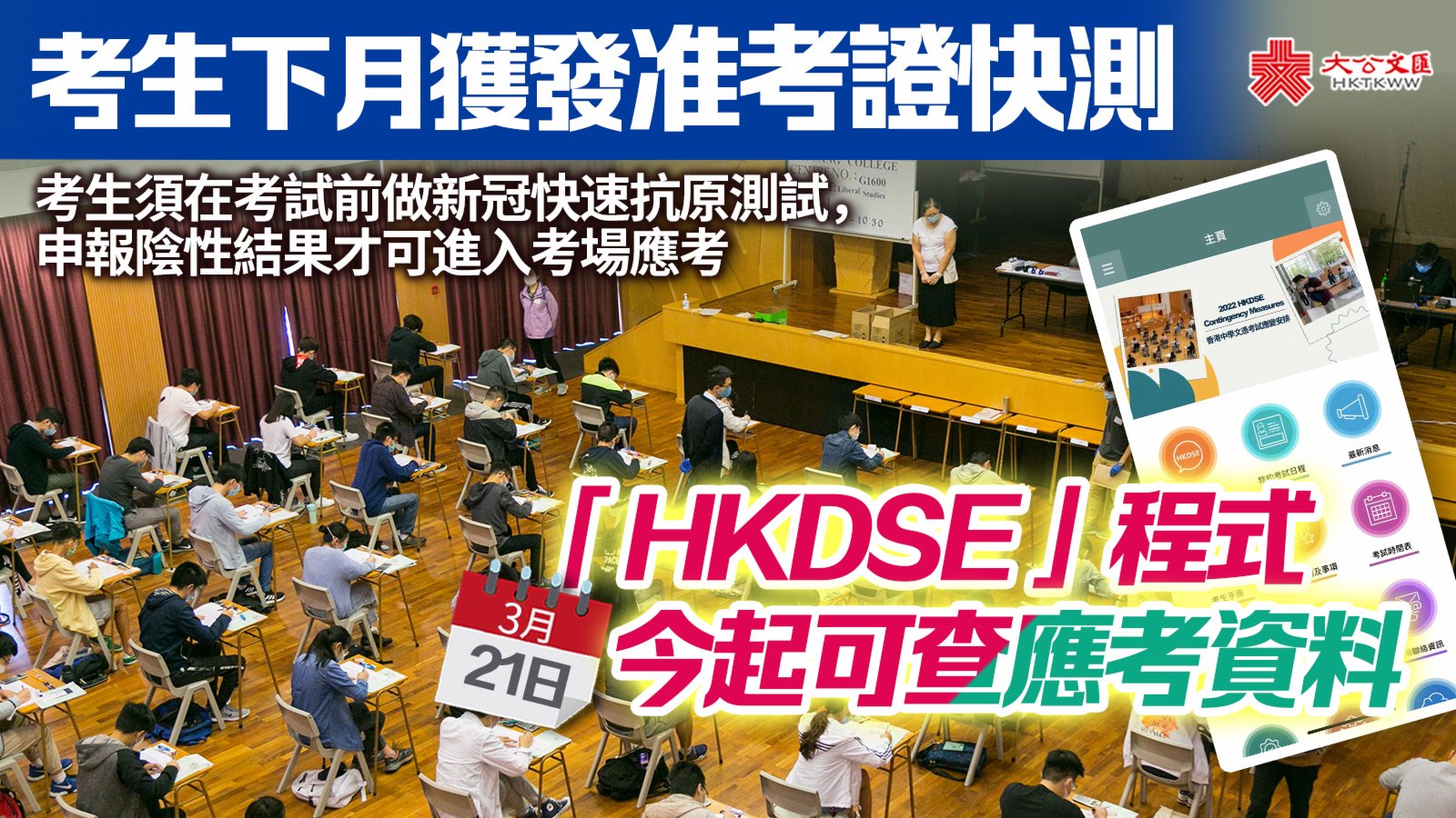 大公文匯全媒體報道,香港中學文憑試暫定4月22日如期開考,考生對疫下開考的相關安排亦十分關注。早前考評局向中學校長發信,指在發放准考證前有特別安排,提醒考生下載「HKDSE」手機應用程式,今日(21日)起至3月31日可登入程式,進入「我的考試日程」查閱報考的筆試科目及試場位置。考生需小心檢查資料,如發現有錯或遺漏,須聯繫考評局跟進。