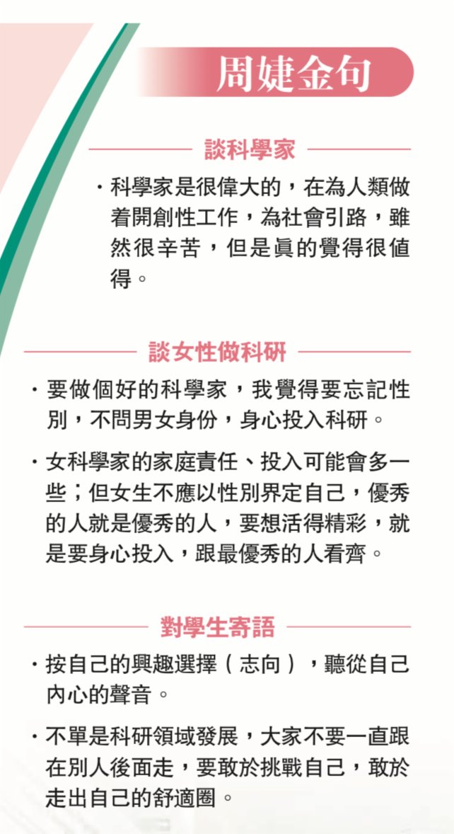 女科學家確實有較大機會面對家庭與工作之間的掙扎,對此周婕感嘆這終歸要看個人選擇,「但要做一個好的科學家,我覺得要忘記性別,跟所有優秀的科學家看齊。」她認為,現今社會中優秀的人就是優秀,無須過問男女身份,寄語女生不應以性別界定自己,重要的是過自己想過的人生。