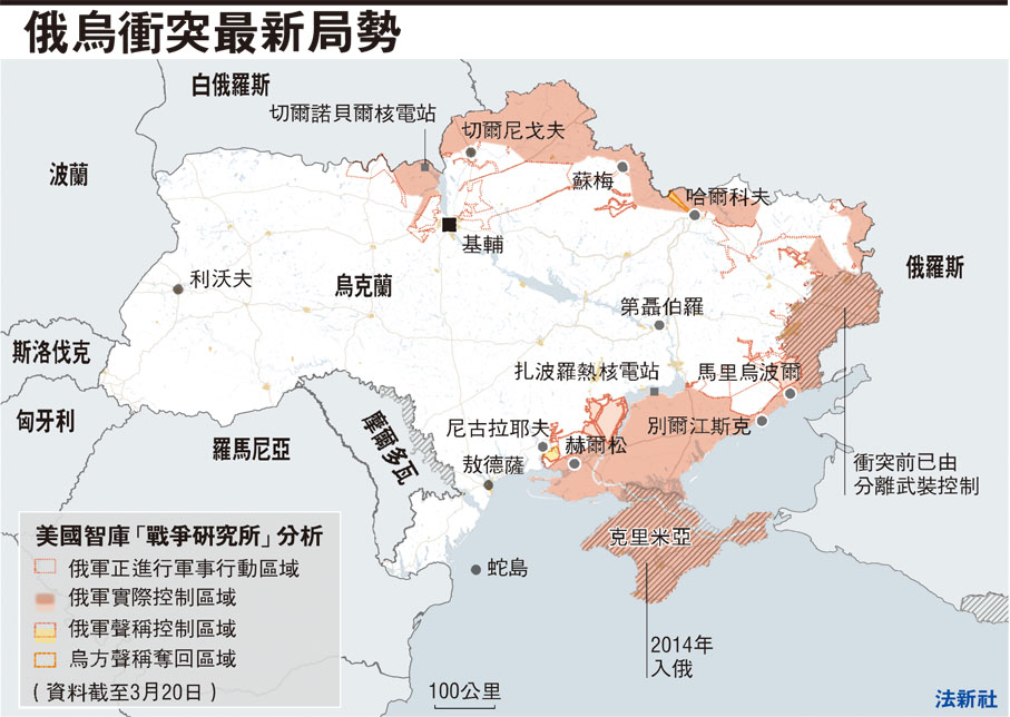 據美國智庫「戰爭研究所」(ISW)估計,俄軍開展「特別軍事行動」以來,實際控制地區面積由第一天的約8萬平方公里,擴大至目前約12.3萬平方公里,但這大部分是在開戰頭兩天取得的進展,自3月2日起,俄軍實際控制的地區面積就沒有太大改變。