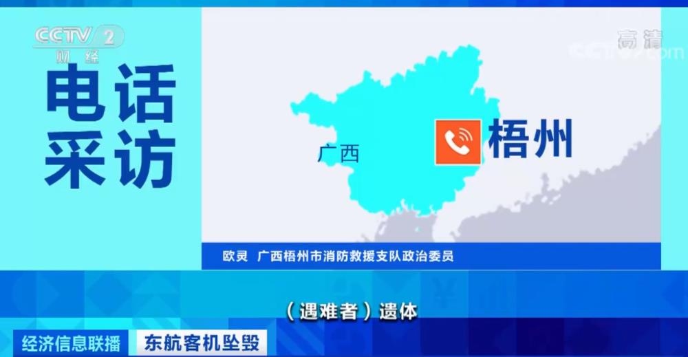 據央視網報道,3月22日,廣西梧州市消防救援支隊政治委員歐靈在電話採訪中稱,「我們協助搜索飛機殘骸,搜救生還者等。我們這組沒有找到生還者,但看到比較大的碎片機翼,(遇難者)遺體」。