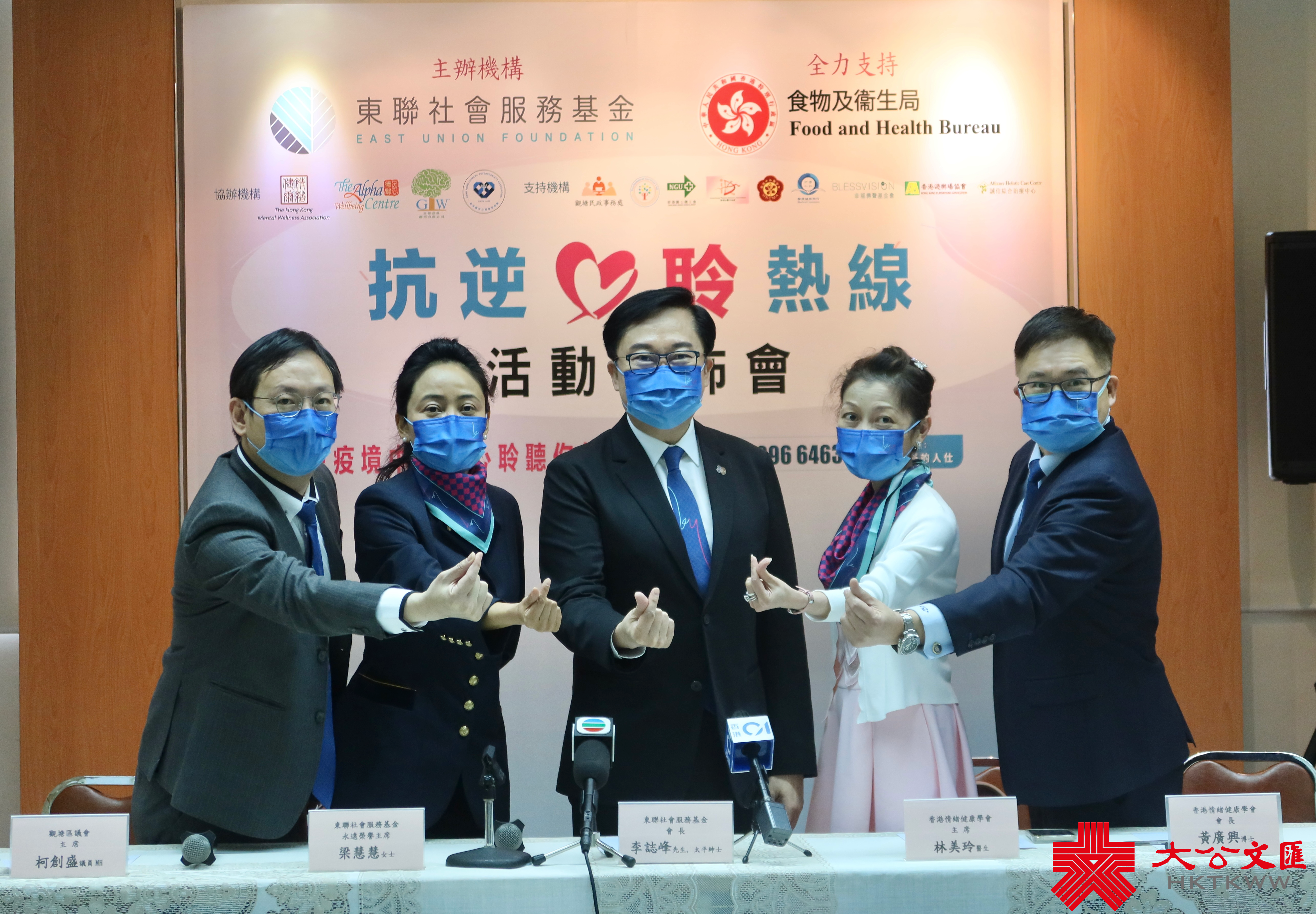 (大公文匯全媒體 記者 楊新雨)香港第五波疫情來勢洶洶,嚴峻程度前所未有,波及數以百萬計的市民。觀塘區議會主席柯創盛、東聯社會服務基金永遠榮譽主席梁慧慧和會長李誌峰、香港情緒健康學會主席林美玲和會長黃廣興共同發起「抗逆心聆熱線」(6996 6463),今日(24日)特舉行活動發布會。熱線凝聚超150位精神健康專業人士,紓解市民情緒困擾和焦慮,有需要則會提供進一步免費心理支援,助他們走出困境。