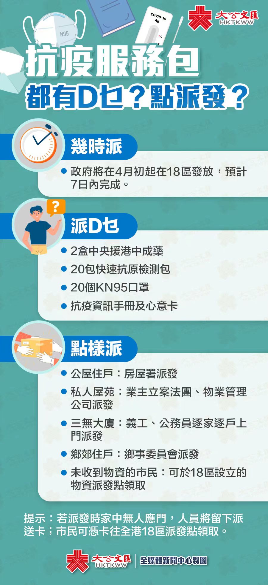 提示:若派發到住戶但無人在家,派發人員會留下派送卡,市民可憑卡往全港18個派發點領取,屆時需作簡單登記。