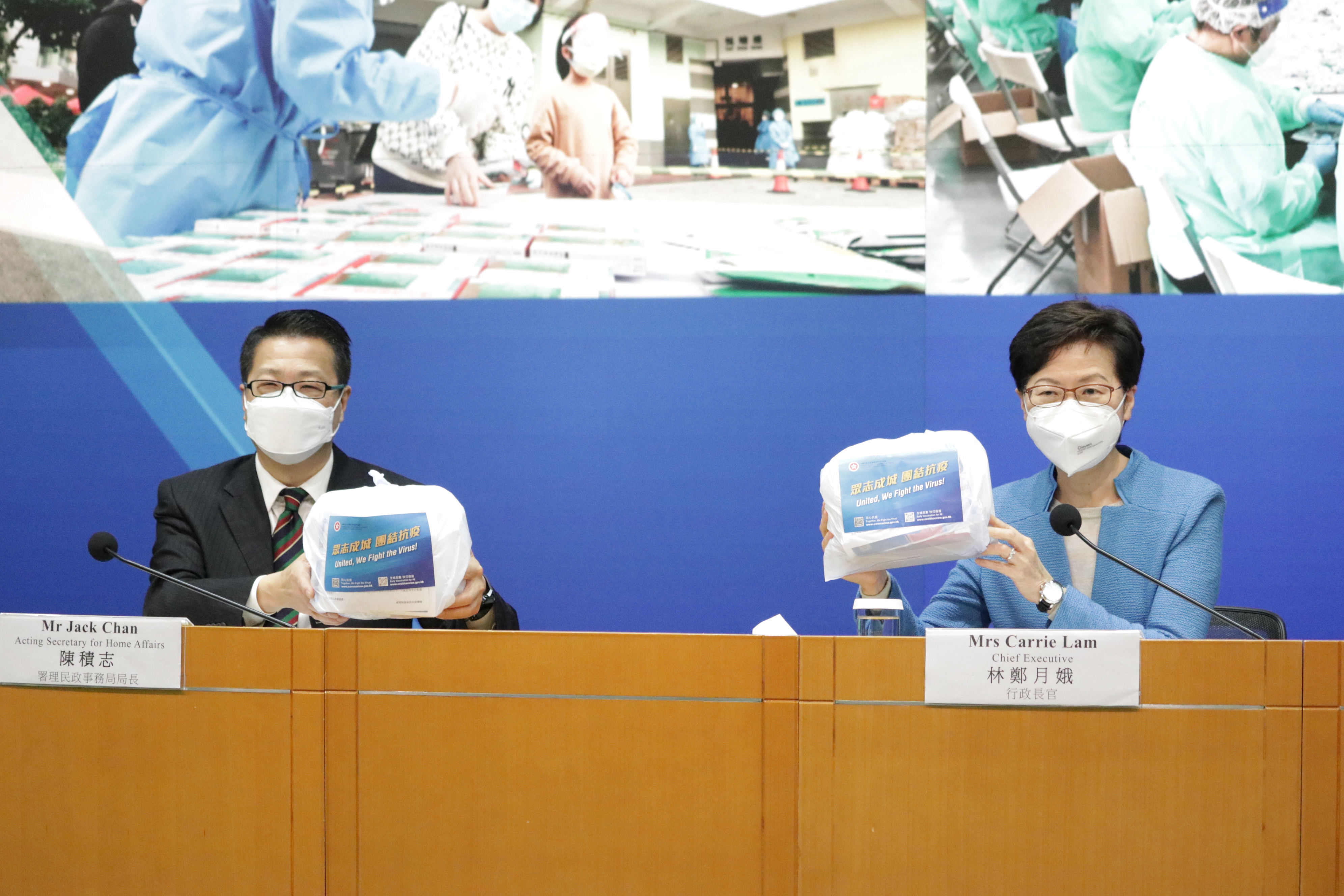大公文匯全媒體報道,特首林鄭月娥於今日(25日)舉行的政府高層記者會宣布,將向全港300萬個家庭,派發防疫服務包;服務包以家庭為單位,面向全港300萬個家庭分發,每個家庭有一包。