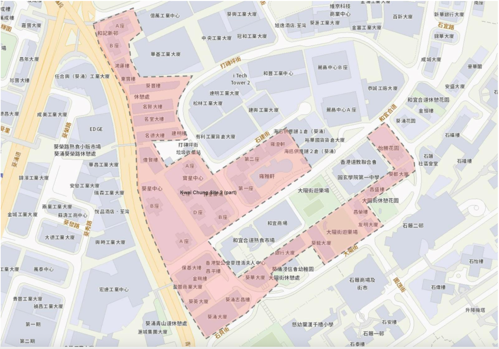 - 葵青區 — 荔欣苑、華荔邨、華豐園、荔灣花園、樂園,青山公路葵涌段、和宜合道及大隴街附近一帶住宅