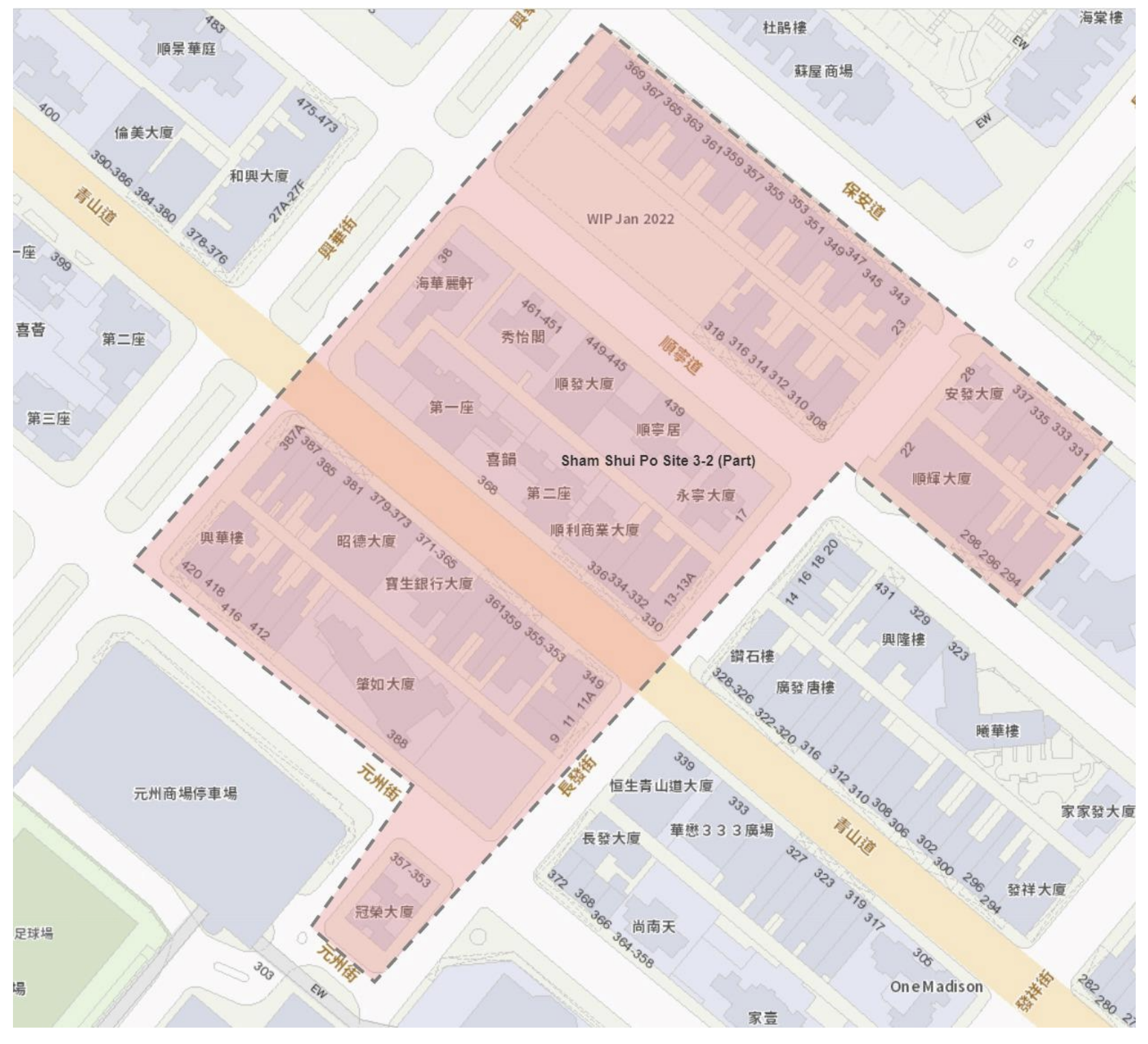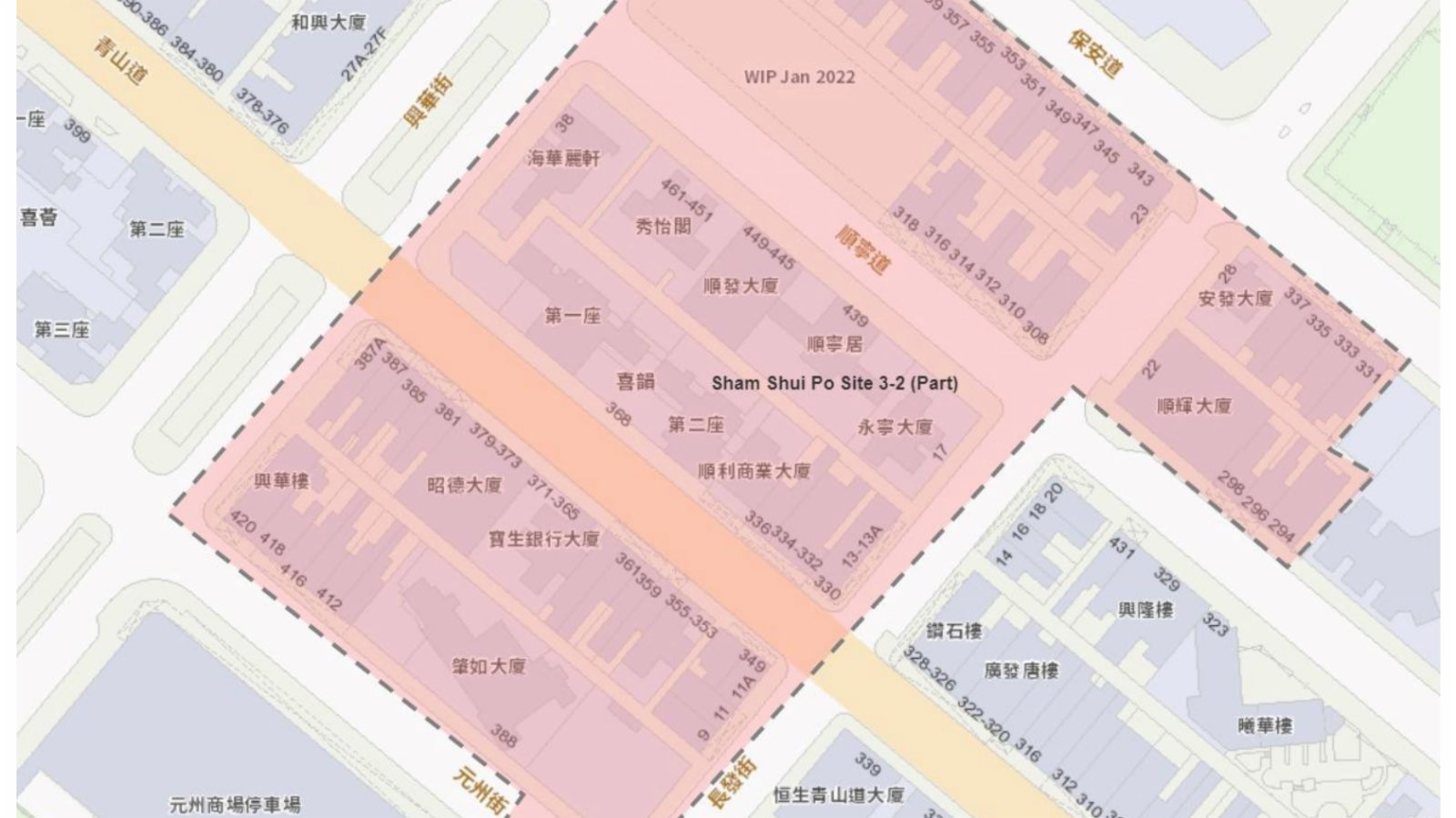 - 深水埗區 — 保安道、興華街、元洲街及長發街附近一帶住宅