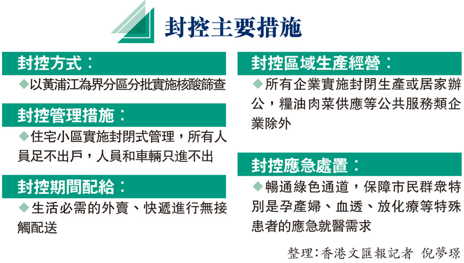 而在封控區域內,所有企業實施封閉生產或居家辦公,保障市民生活和城市基本運行的水、電、燃油、燃氣、通訊、交通、環衞、糧油肉菜供應等公共服務類企業除外。在封控區域內,也將暫停公交、地鐵、輪渡、出租汽車、網約車運行。疫情防控、緊急就醫、生活保障、城市運行、應急處置等相關車輛,需經各區政府或各行業主管部門認定核實後通行,其餘車輛非必要不上路。