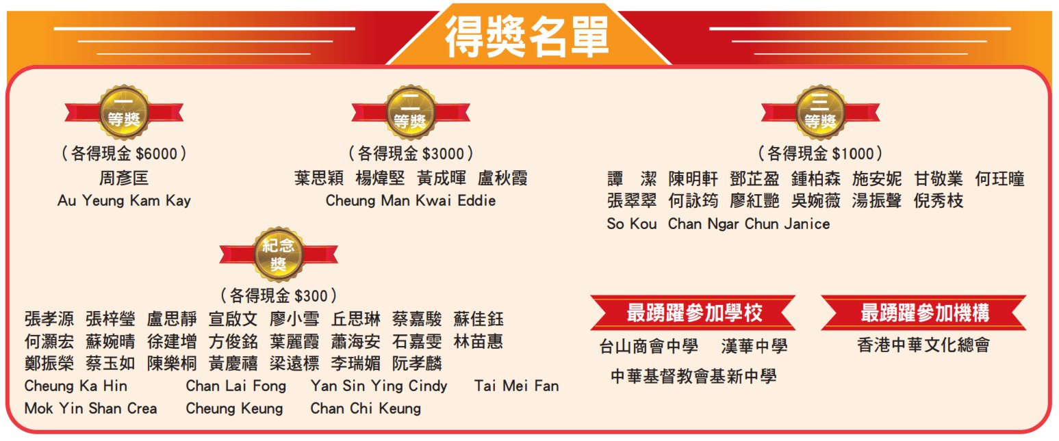 此外,台山商會中學、漢華中學、中華基督教會基新中學獲最踴躍參加學校獎,香港中華文化總會獲最踴躍參加機構。