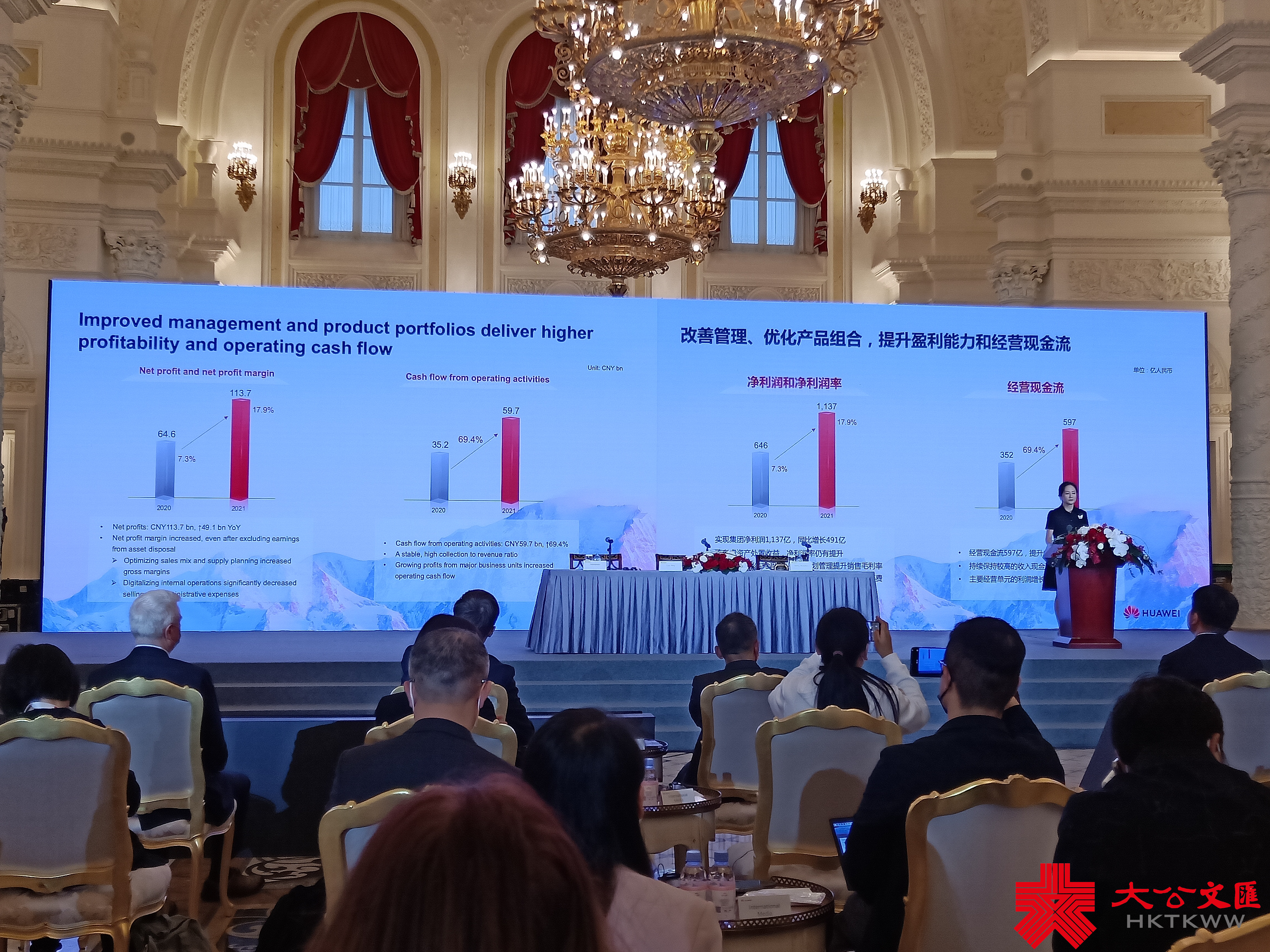 出現在全球近兩百位記者及分析師面前的孟晚舟在解讀華為年報時從容且淡定,她用20分鐘左右的時間解讀了6張PPT,落腳在「穩健經營,投入未來」。她向外界傳遞華為「財務穩健,整體經營結果符合預期」的信號,稱「華為的運營商業務、企業業務、消費者業務均增長在30%以上」,並向外界承諾華為將「加大對未來的投入」。