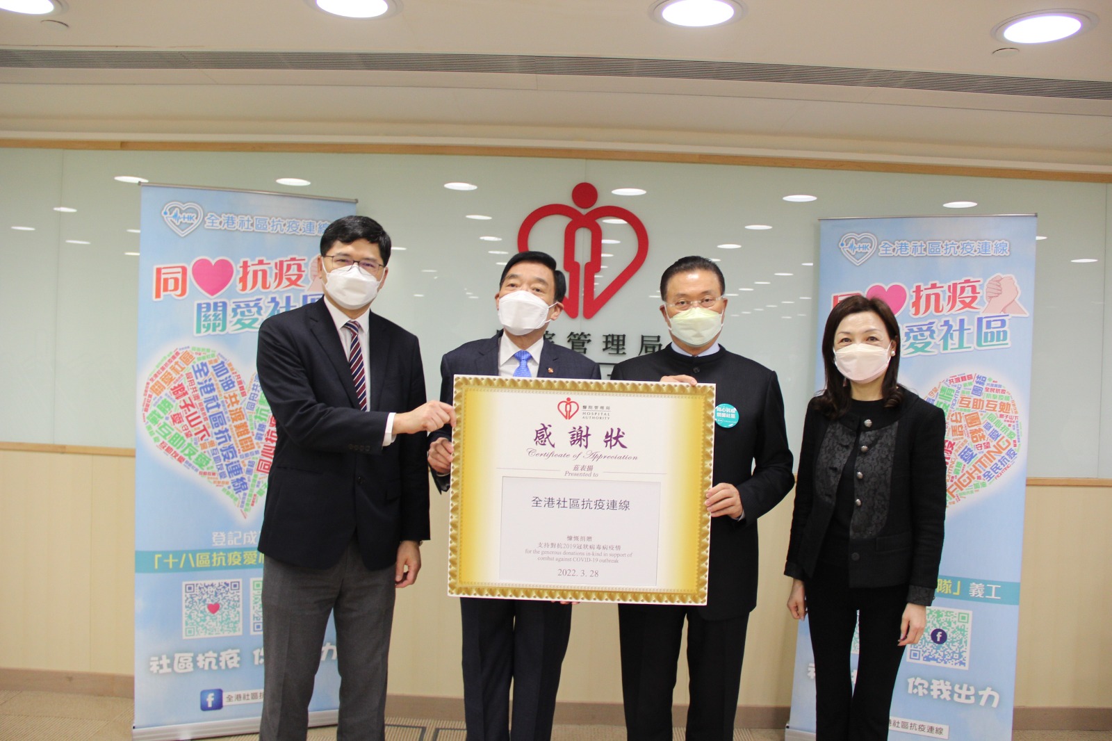 大公文匯網報道,「全港抗疫義工同盟」、「全港社區抗疫連線」總召集人陳振彬與秘書長徐海山今日(28日)中午前往醫管局總部,向醫管局主席范鴻齡及行政總裁高拔陞贈送10萬份愛心禮物包予醫管局全體醫護人員及內地援港醫療團隊,感謝醫護人員一直緊守崗位,在抗疫最前線搶救生命。