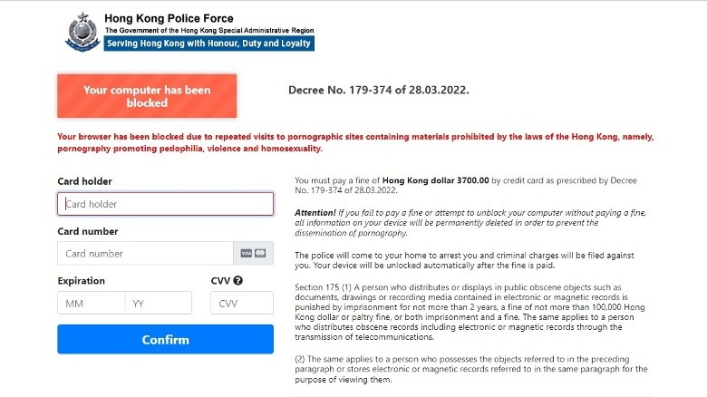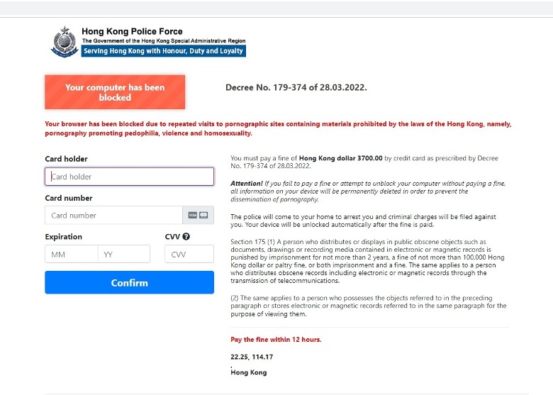 警方指,偽冒香港警察的釣魚欺詐網站為(https://gdpayjoojen2[.]xyz/?c=0011),有關網站聲稱市民曾經瀏覽色情網站,違反相關「香港法例」,要求市民提供其信用卡資料以繳付罰款,否則市民會被拘捕,其電子裝置的資料亦會被刪除。