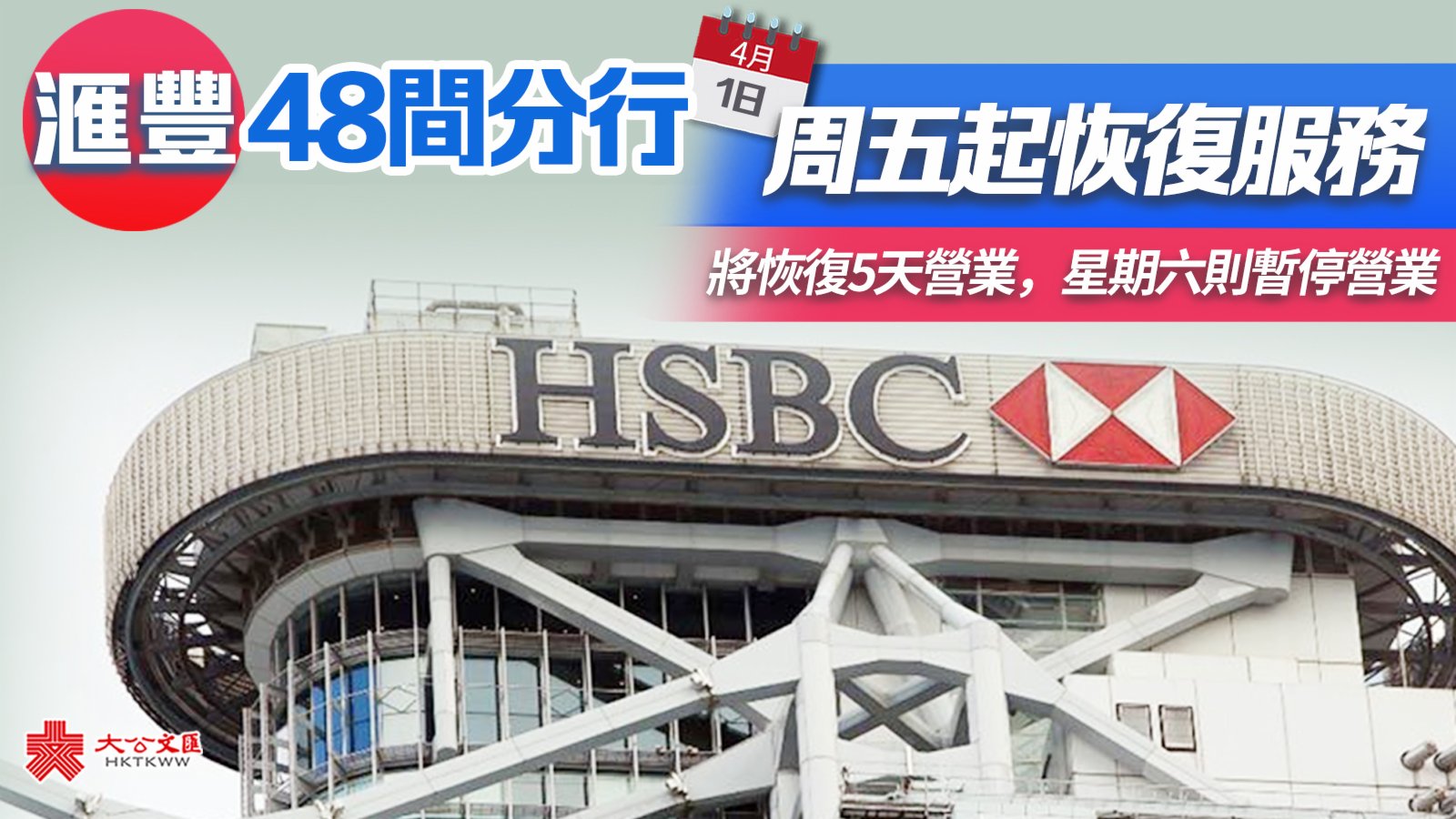 另外,中上環及尖沙咀的中小企中心本周五重開,提供服務的中小企中心增至7間,其餘4間繼續暫停營業至另行通知。至於3間分別位於滙豐總行大廈、旺角及觀塘的主要分行,會維持周一至六營業。