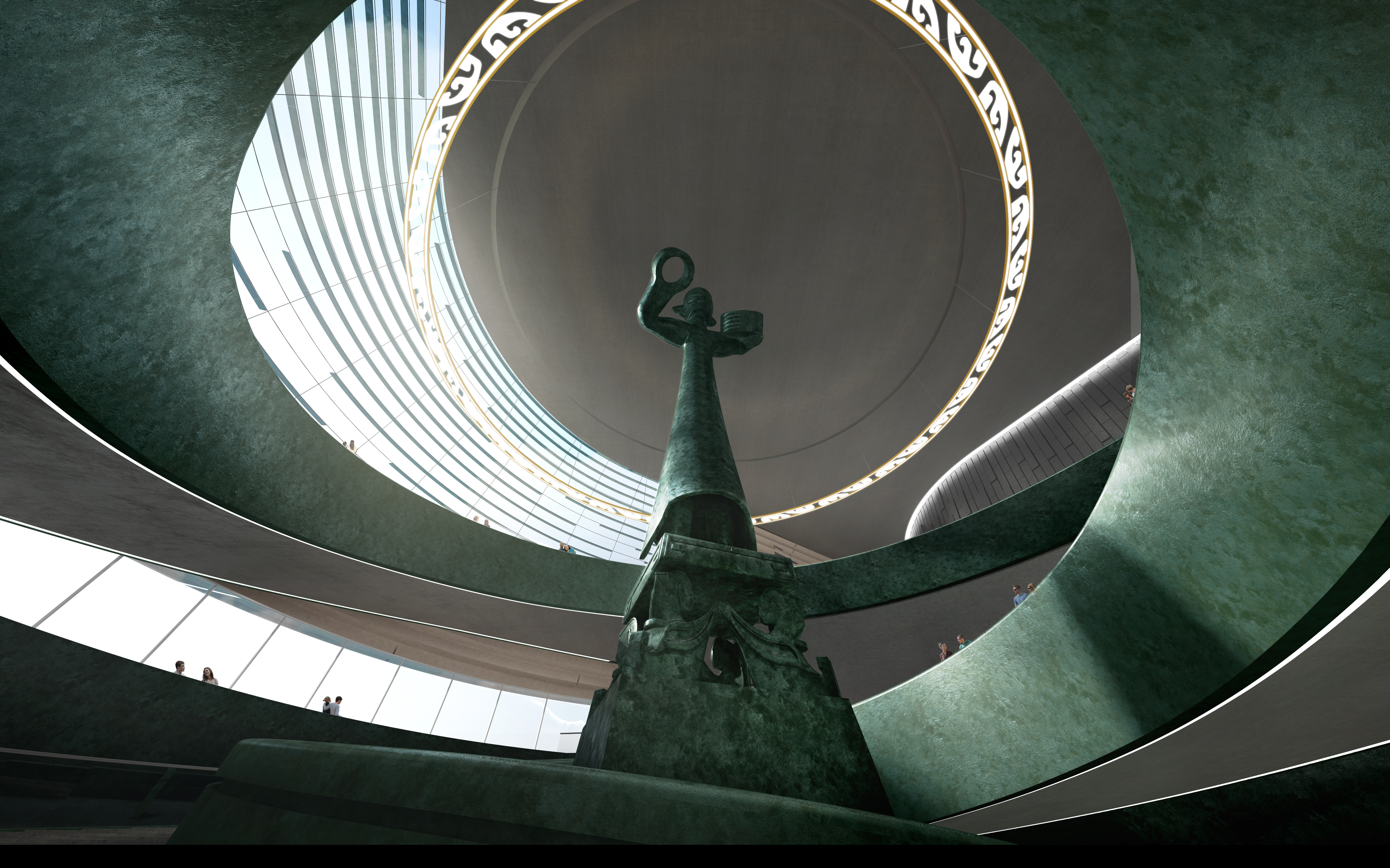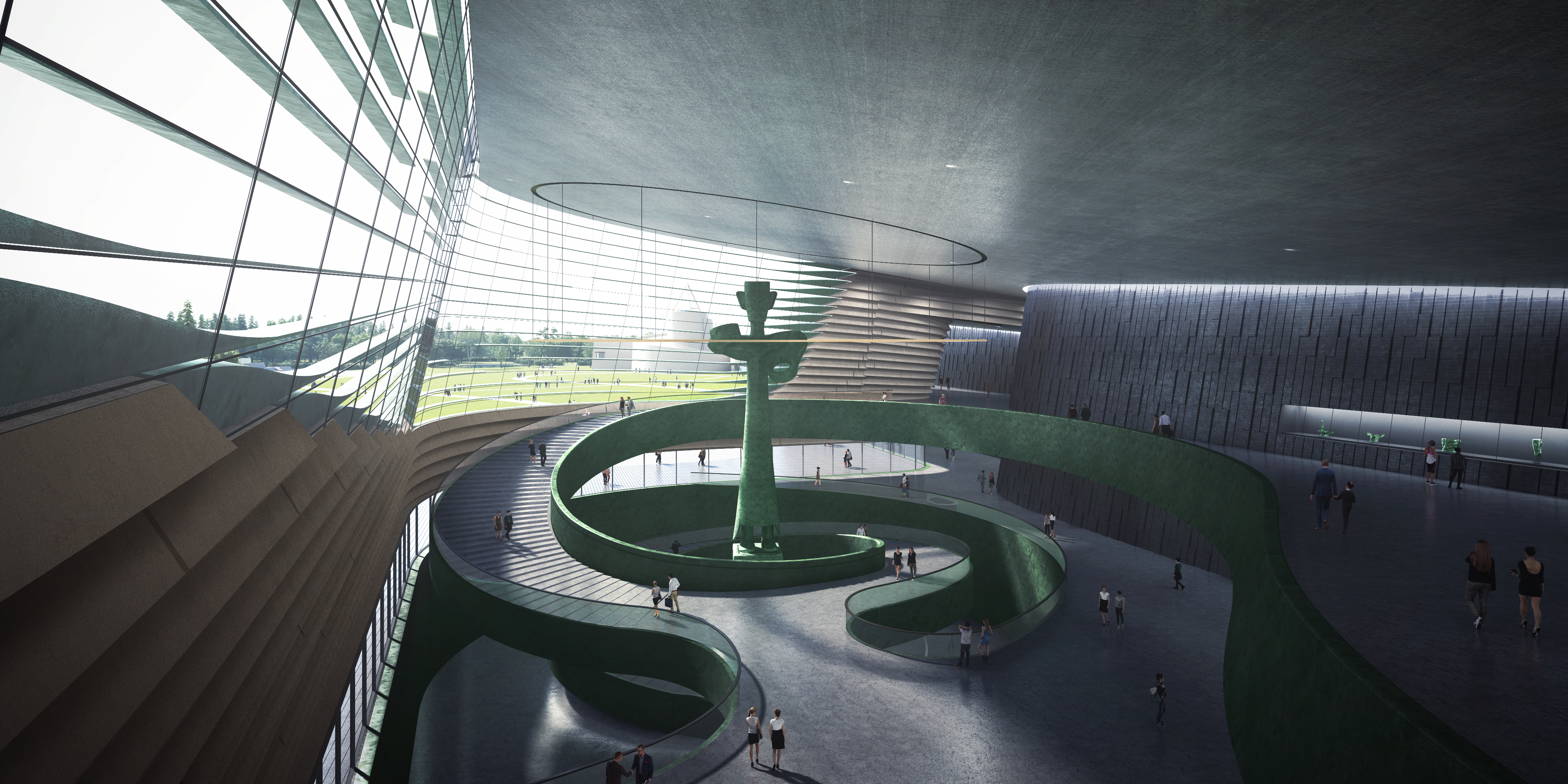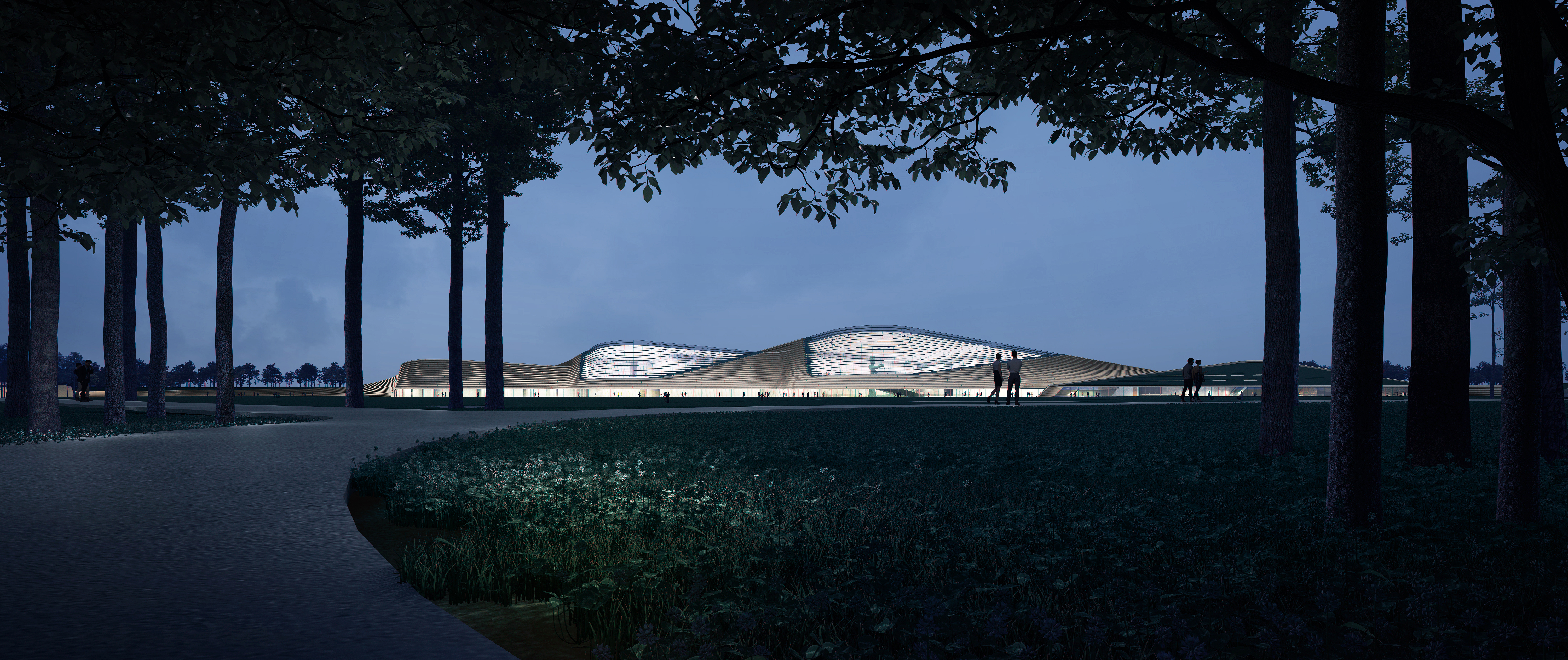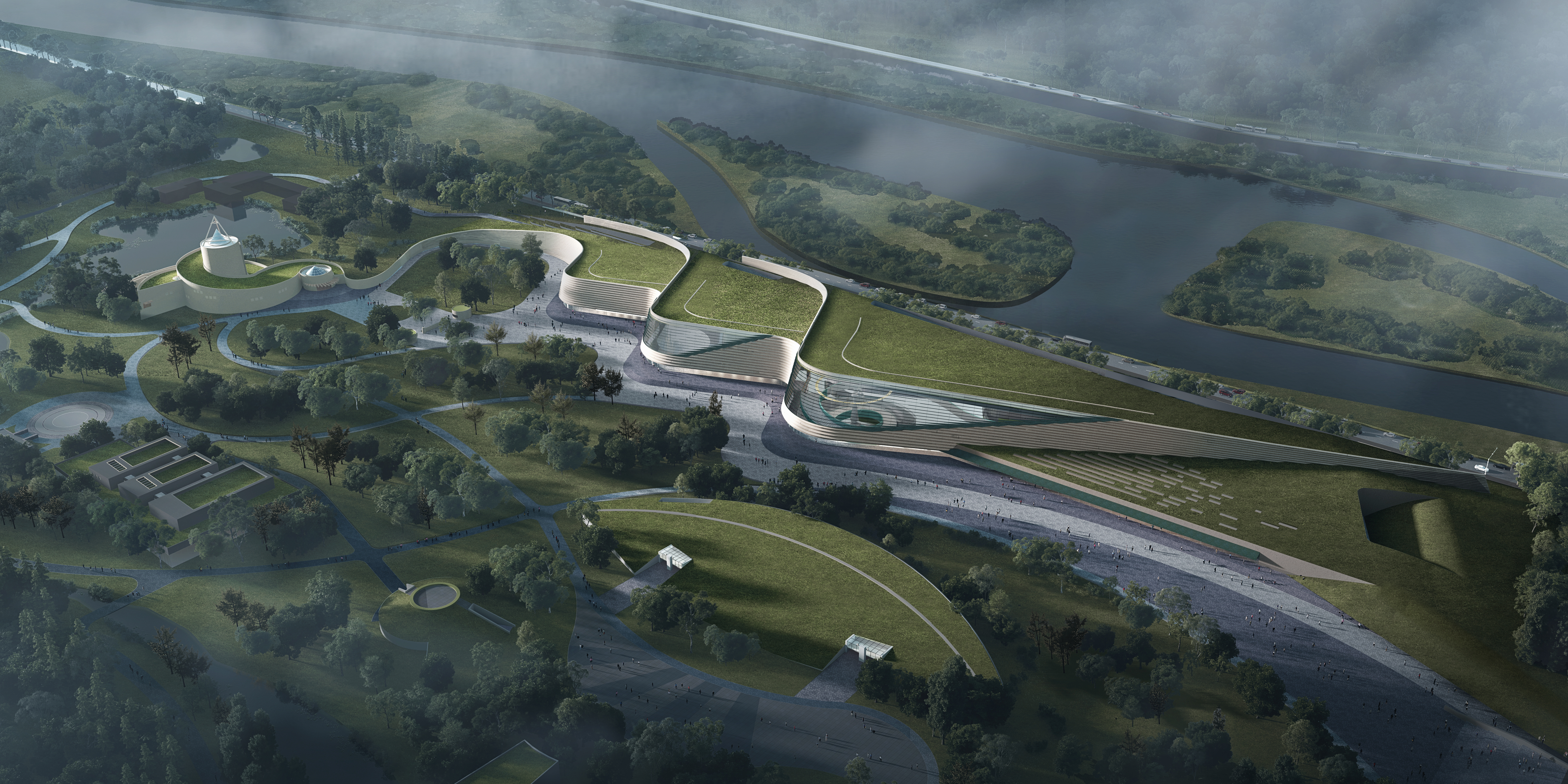 新館設計將青銅館經典的螺旋曲線外牆延續展開,並從三星堆文物中提煉線條,作為三個堆體外形和內部空間的控制曲線。屋頂傾斜延伸,消隱融入場地,與原有的綜合館形體左右呼應,形成三個沿中軸排列的覆土堆體,寓意「堆列三星」,使建築的形體概念同源傳承「三星堆」遺址名稱。