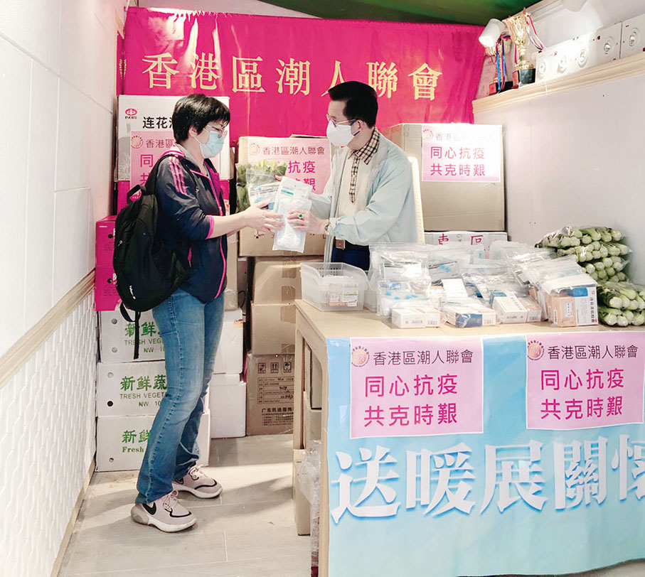 在抗疫期間,香港區潮人聯會積極響應特區政府16項抗疫舉措,默默地為社會做貢獻,除了出力,還多次購買防疫抗疫物資,組織義工隊,將物資派發給有需要的市民。在2月已募集到4000盒測試劑,由香港區潮人聯會首長捐贈,並及時將抗疫物資派發給會員、義工及街坊市民。