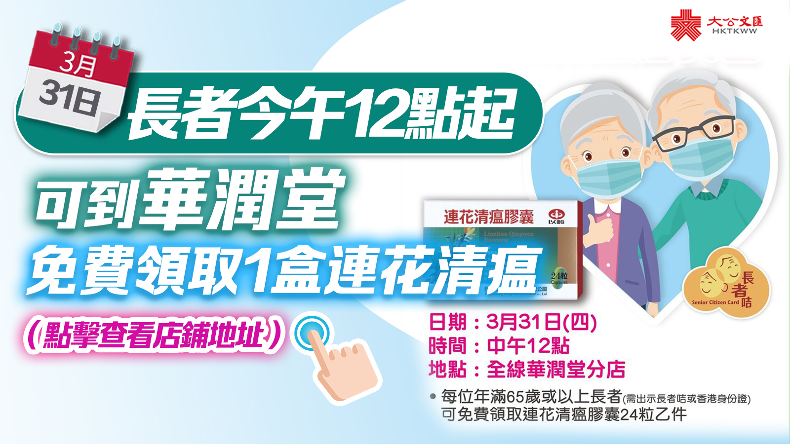 - 形式:每位年滿65歲或以上長者(需出示長者咭或香港身份證)可免費領取連花清瘟膠囊24粒乙件