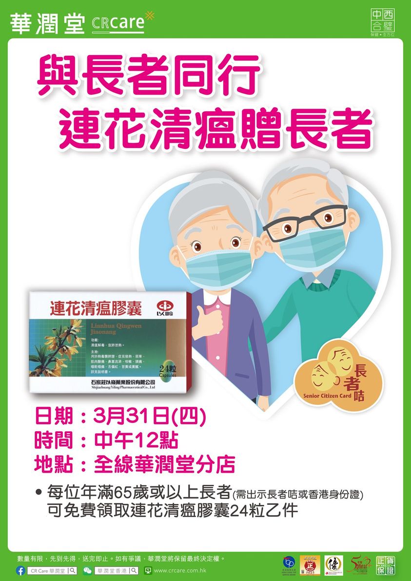 大公文匯全媒體報道,華潤集團旗下公司華潤堂今日(31日)在社交媒體宣布,將於今日中午12點起,向年滿65歲或以上長者免費派發1.1萬盒連花清瘟膠囊。65歲或以上長者只需出示長者咭或香港身份證,即可免費獲贈「連花清瘟」膠囊一盒,數量有限,送完即止。華潤堂表示,與香港市民同舟共濟,齊心抗疫,希望早日戰勝疫情。