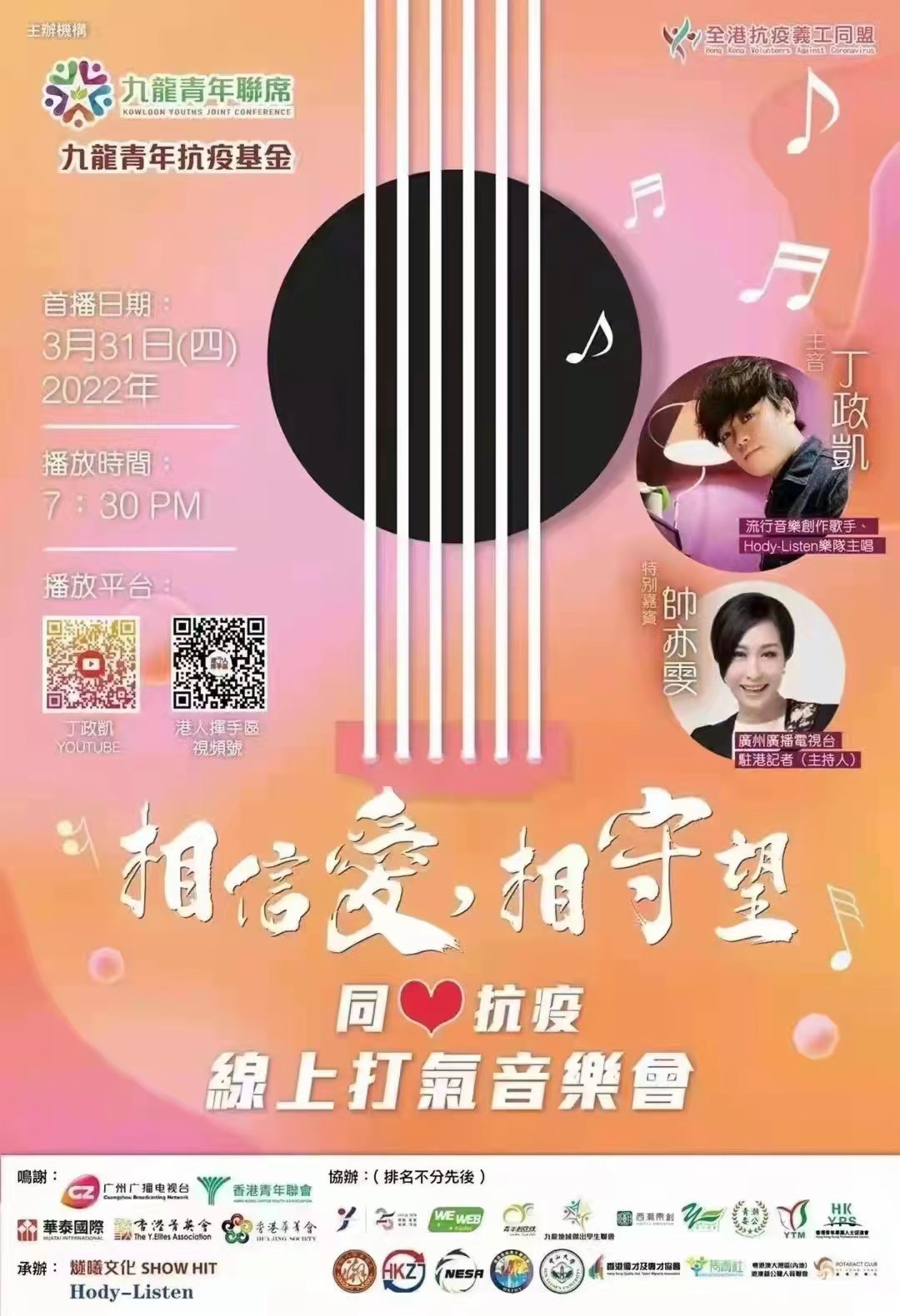 據悉,「相信愛·相守望」同心抗疫網上打氣音樂會,以號召及團結青年繼續參與抗疫防疫,同心戰勝疫情為目標,呼籲廣大青年朋友,積極回應防疫抗疫工作需要,配合政府和全社會共同抗疫,全力支援前線醫護和義工,幫助被疫情所困的青年朋友。該活動得到廣州廣播電視台﹑香港青年聯會﹑華泰國際﹑香港菁英會﹑香港華菁會及立法會議員梁毓偉﹑李慧琼﹑謝偉俊﹑鄭泳舜﹑梁文廣﹑陳凱欣﹑楊永傑﹑鄧家彪﹑顏汶羽等支持。