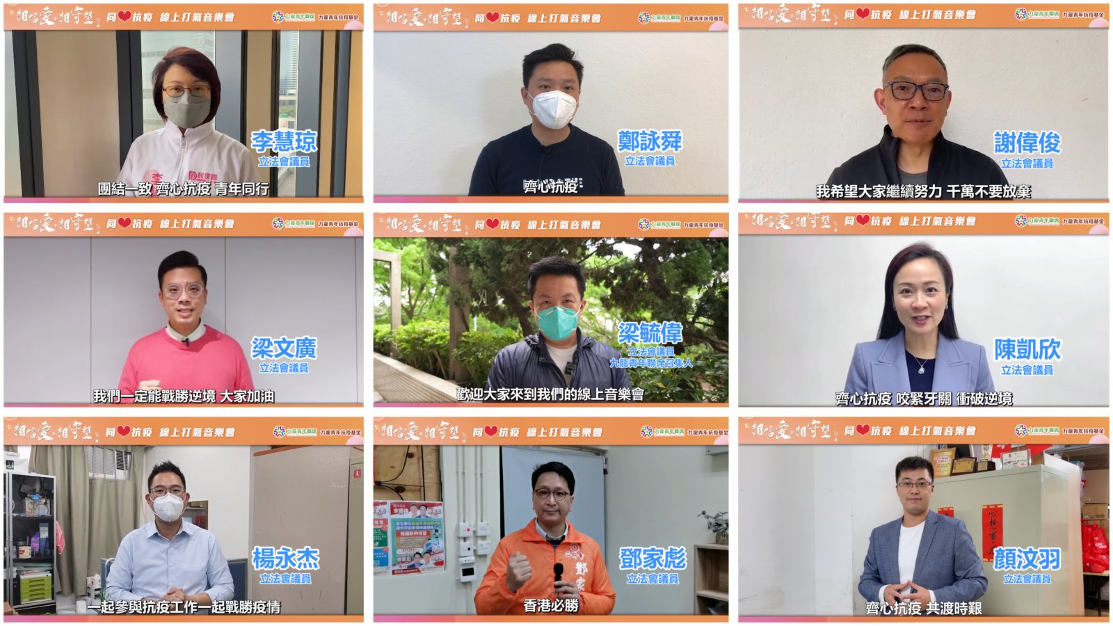大公文匯網報道,由九龍青年聯席及九龍青年抗疫基金主辦﹑燧曦文化及 HODY LISTEN 承辦的「相信愛·相守望」同心抗疫網上打氣音樂會今日(31日)晚在線上舉行。一眾青年團體首長及議員紛紛致辭及發表鼓勵語句,為本港各界人士打氣。音樂會在不同網上平台播放後引起共鳴:「在中央支援下,各界人士只要團結一心、互相扶持,定能戰勝疫情」。