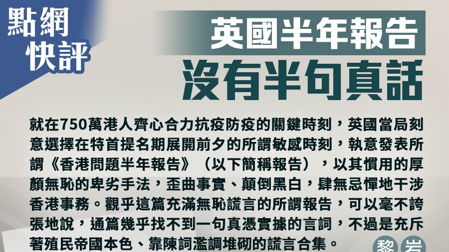 就在750萬港人齊心合力抗疫防疫的關鍵時刻,英國當局刻意選擇在特首提名期展開前夕的所謂敏感時刻,執意發表所謂《香港問題半年報告》(以下簡稱報告),以其慣用的厚顏無恥的卑劣手法,歪曲事實、顛倒黑白,肆無忌憚地干預香港事務。觀乎這篇充滿無恥謊言的所謂報告,可以毫不誇張地說,通篇幾乎找不到一句真憑實據的言詞,不過是充斥著殖民帝國本色、靠陳詞濫調堆砌的謊言合集。