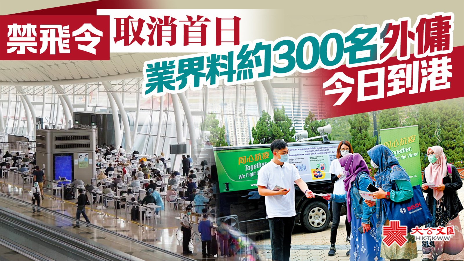 大公文匯全媒體報道,政府今日(4月1日)起取消9個國家「禁飛令」,全日有4班相關航班抵港,三班來自馬尼拉、一班來自倫敦,約有兩千名港人返港。入境團旅遊接待協會主席梁耀霖則估算今日約有300名外傭到港,仍有6000至7000人等候機位。
