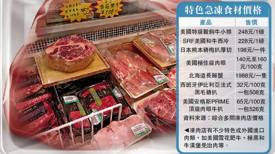 特色凍肉店的食材,急凍肉扒、海鮮、火鍋食材、調味料等,來自英、美、歐、日、韓等地,部分可賣至每磅250元,甚至過千元。