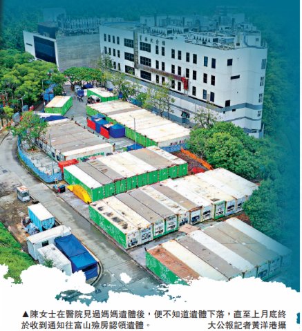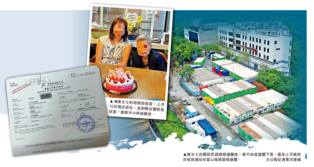 (大公報記者 伍軒沛)第五波新冠疫情累計死亡患者已達7959人,當中不少患者離世後,遺體失蹤,家屬承受喪親之痛,還要奔走尋找親人遺體。陳女士(化名)的媽媽在公立醫院的急症室離世後,陳女士見過遺體最後一眼,直到在公眾殮房再次見到媽媽,已相隔二十日,認領遺體時赫然發現媽媽變得面目全非,嚴重膨脹,五官浮腫,皮膚瘀黑,只憑一頭白髮的特徵,相信眼前的就是自己的媽媽。