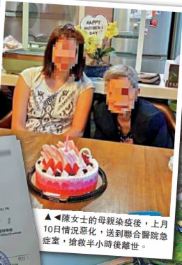 《大公報》上月報道,陳女士的83歲母親,今年1月入住安老院,2月院舍爆發疫情,媽媽也確診了,3月10日情況惡化,送到聯合醫院急症室,搶救半小時後離世。