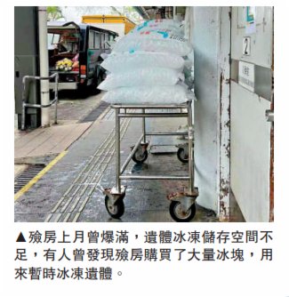 據了解,由於遺體堆積,認領工作編排得密密麻麻,殮房工作人員忙得不可開交,殯儀業人員也需幫忙從殮房外的冰凍貨櫃取出遺體。殯儀業商會永遠榮譽會長吳耀棠表示,近日從業界獲悉富山殮房情況,「貨櫃是放在室外的鐵皮櫃,日間陽光照曬,很難達到(攝氏)4度。(貨櫃)裏面無燈光,也很臭,工作人員找遺體有困難,有時可能會不小心踩到屍袋。」